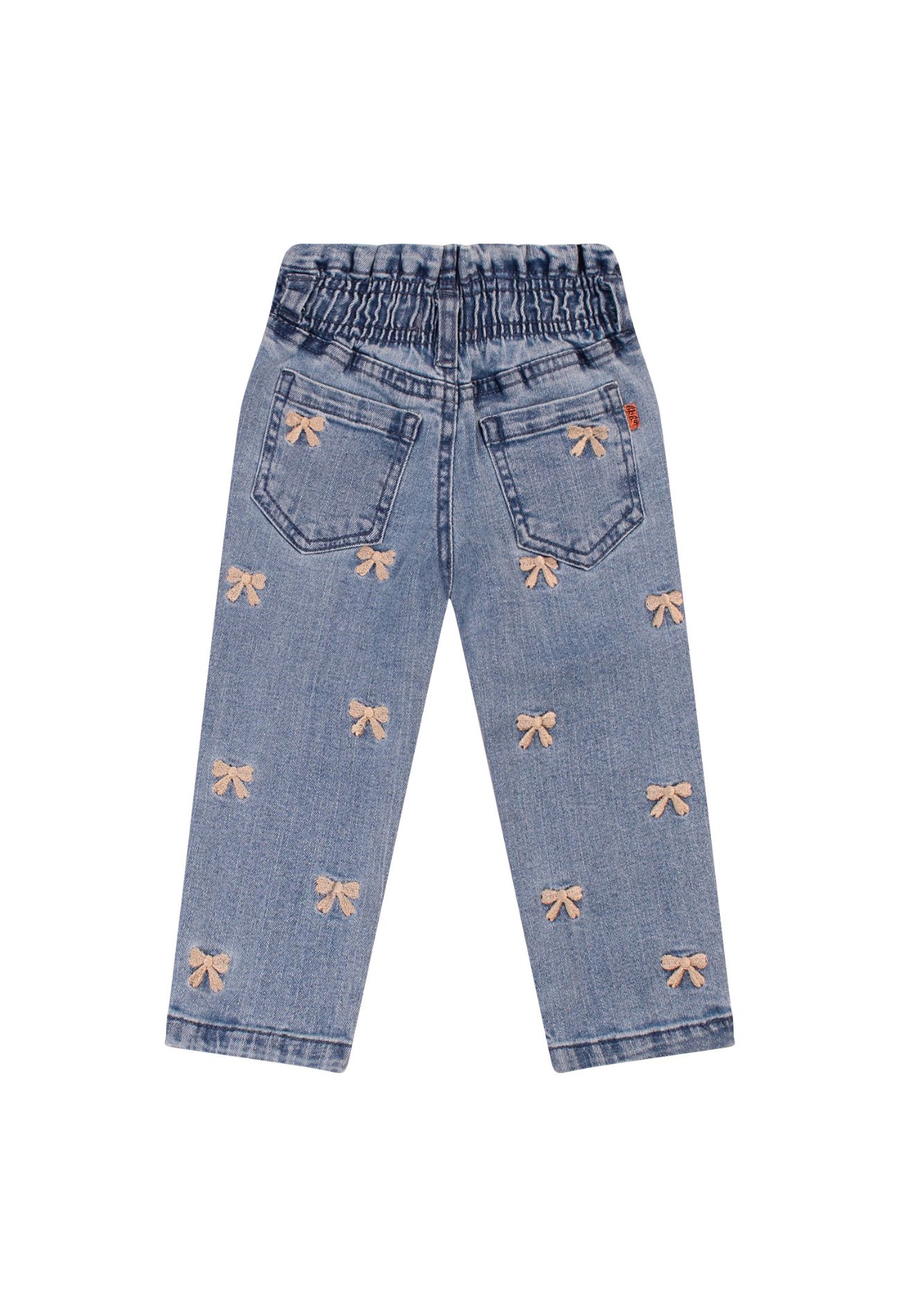 Trendy jeans met geborduurde strikjes voor een speelse touch. Het model heeft een paperbag-taille, waardoor hij mooi aansluit en tegelijk comfortabel zit. Perfect te combineren met een simpel topje of blouse.