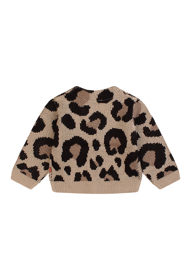 Dit stijlvolle vestje voor baby meisjes combineert comfort met een speelse, trendy uitstraling. Het panterdessin zorgt voor een stoere look, terwijl de subtiele lurex glansdraad een vleugje sprankeling toevoegt. De V-hals en knoopsluiting geven het vestje een klassieke touch. Perfect om over een jurkje of shirtje te dragen op koelere dagen.