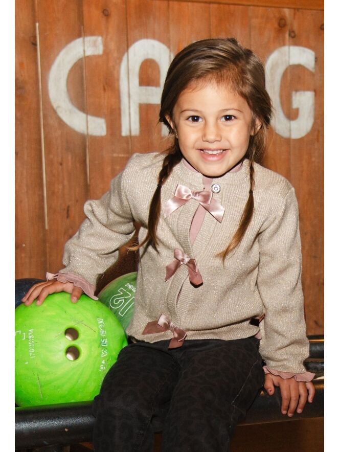 Dit fijngebreide vestje voor baby meisjes combineert zachte warmte met een subtiele glans dankzij het lurexdraad. De ballonmouwen geven een speelse touch, terwijl de drie strikken op de voorkant zorgen voor een lieve en stijlvolle uitstraling.
