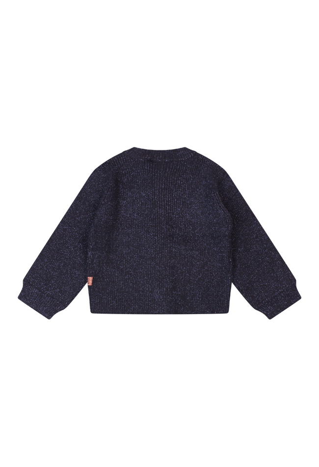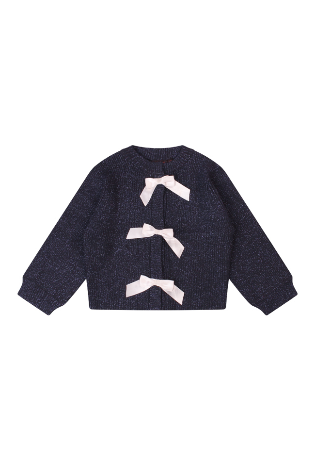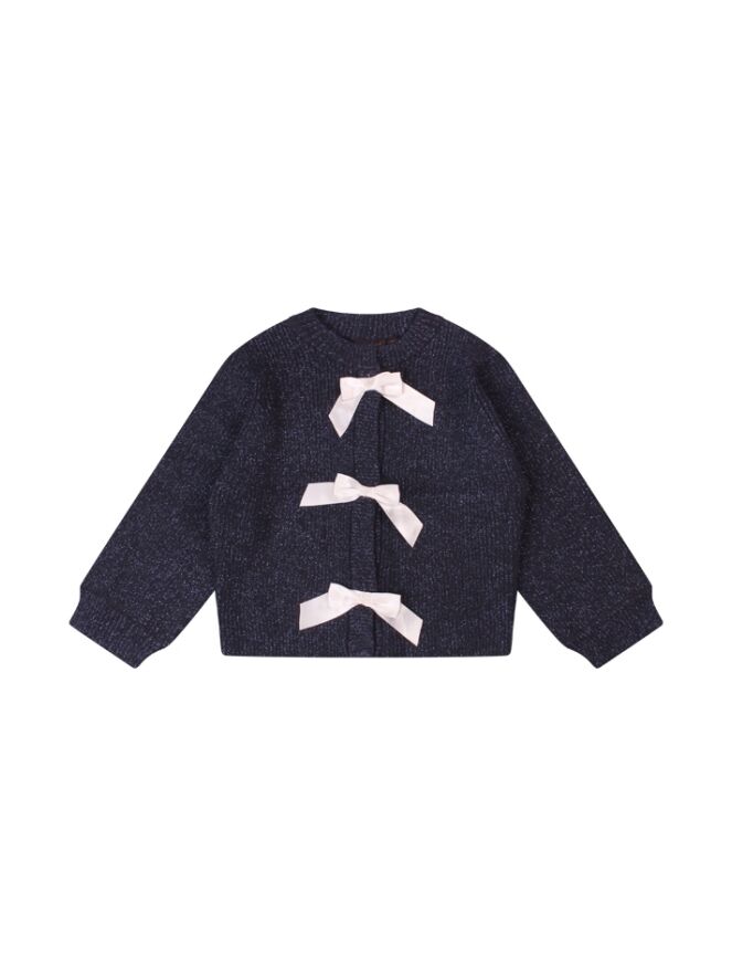 Dit fijngebreide vestje voor baby meisjes combineert zachte warmte met een subtiele glans dankzij het lurexdraad. De ballonmouwen geven een speelse touch, terwijl de drie strikken op de voorkant zorgen voor een lieve en stijlvolle uitstraling.