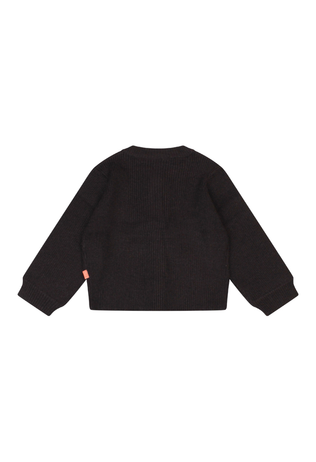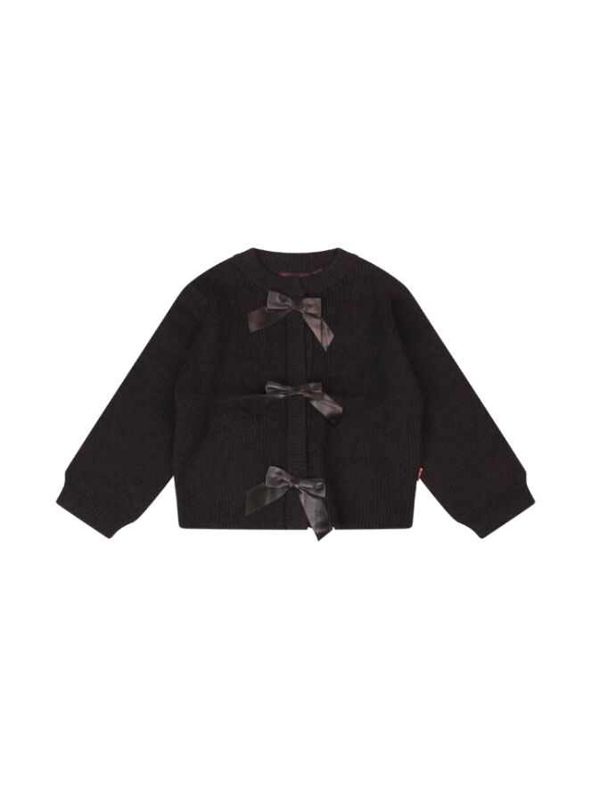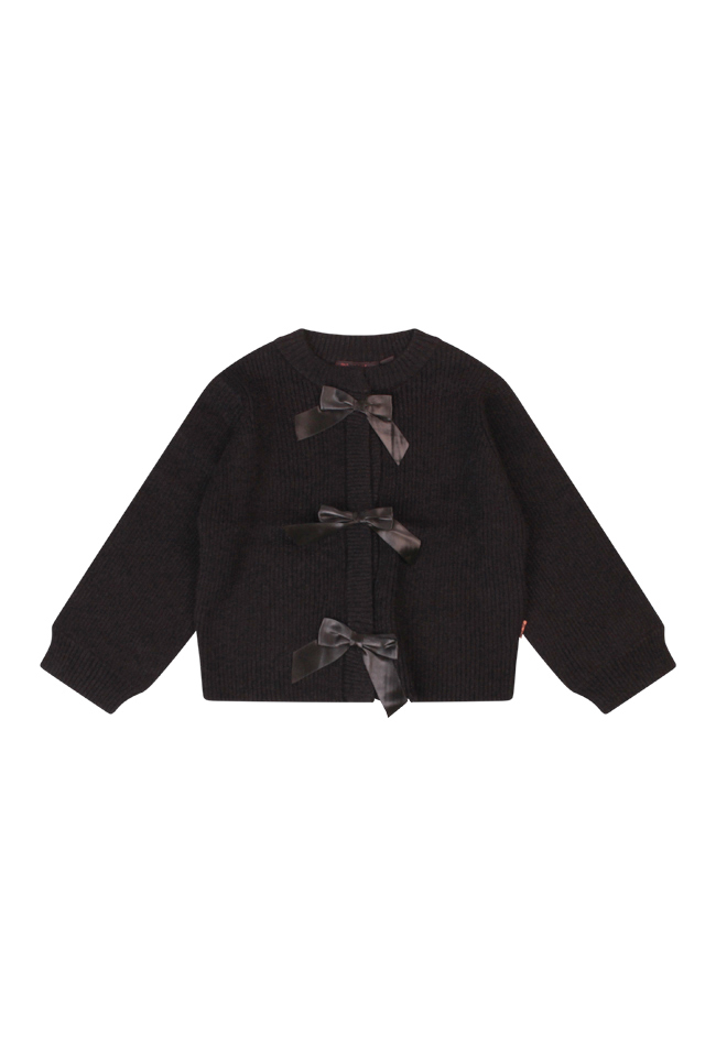 Dit fijngebreide vestje voor baby meisjes combineert zachte warmte met een subtiele glans dankzij het lurexdraad. De ballonmouwen geven een speelse touch, terwijl de drie strikken op de voorkant zorgen voor een lieve en stijlvolle uitstraling.