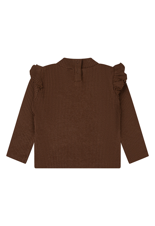 Deze lieve top voor baby meisjes is gemaakt van een zachte ribbrei met een subtiel lurex draadje voor een vleugje glans. De turtleneck zorgt voor extra warmte, terwijl de ruches op de schouders een speelse en schattige uitstraling geven. Perfect te combineren met een rokje of broekje voor een stijlvolle outfit.
