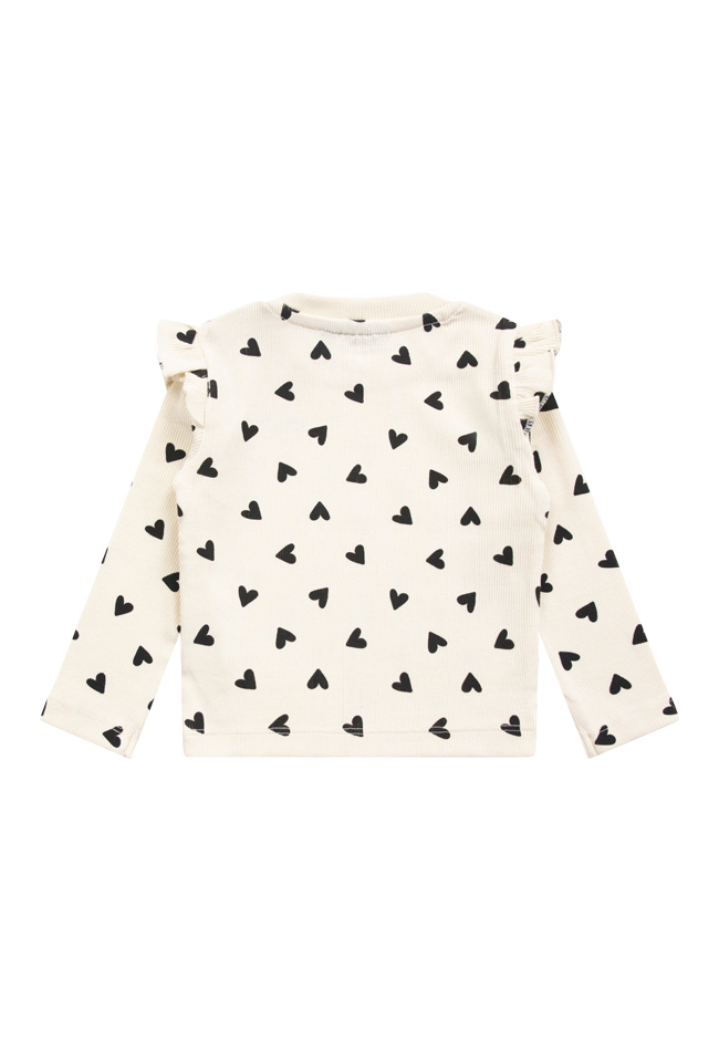 Fijn T-shirtje met een mooie ruche op de schouder en een opdruk vol met hartjes! Leuk te combineren met een spijkerbroek of effen flair broekje.