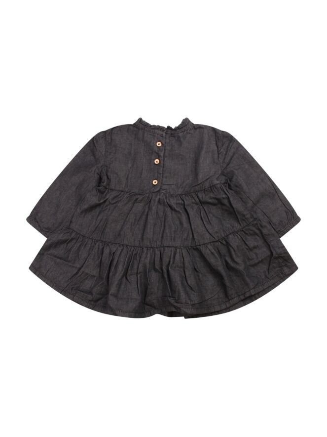 Ruimvallend jurkje van Bakkaboe van 100% katoen in denim style! Dit jurkje sluit met houtlook knoopjes op de rug.