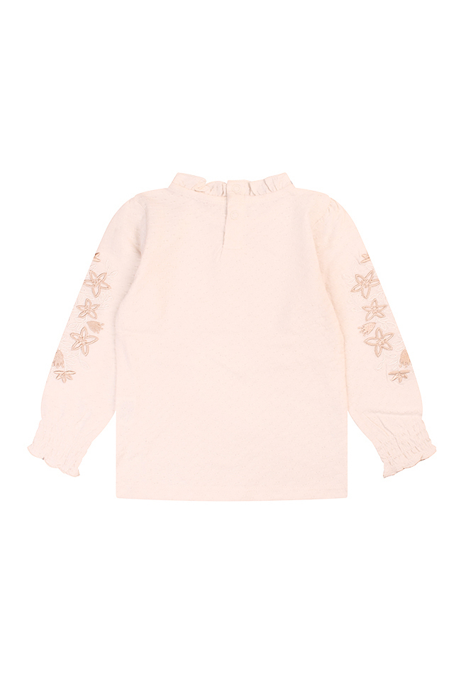 Deze schattige baby meisjes top is een echte must-have! De top is gemaakt van dobby-stof en afgewerkt met prachtig geborduurde bloemen op de mouwen. De smock turtle hals zorgt voor een lieve, speelse uitstraling. Perfect te combineren met een flared broek en een gilet voor een trendy en complete outfit.