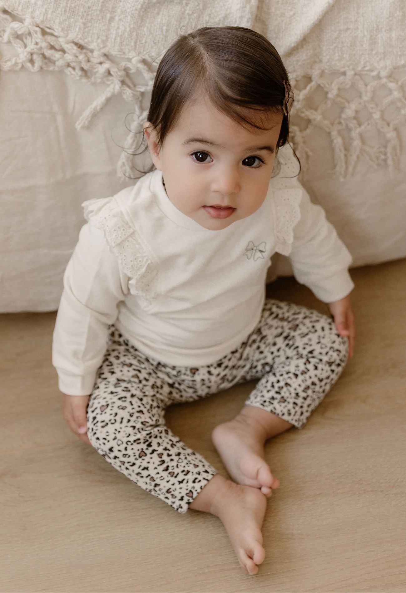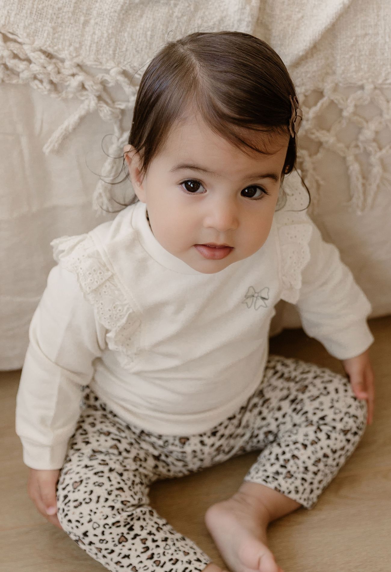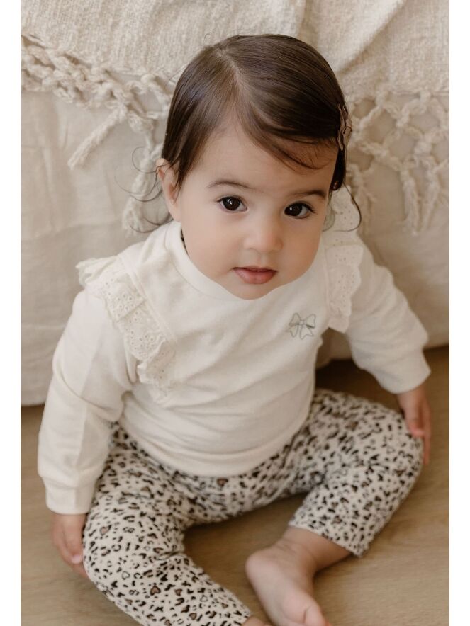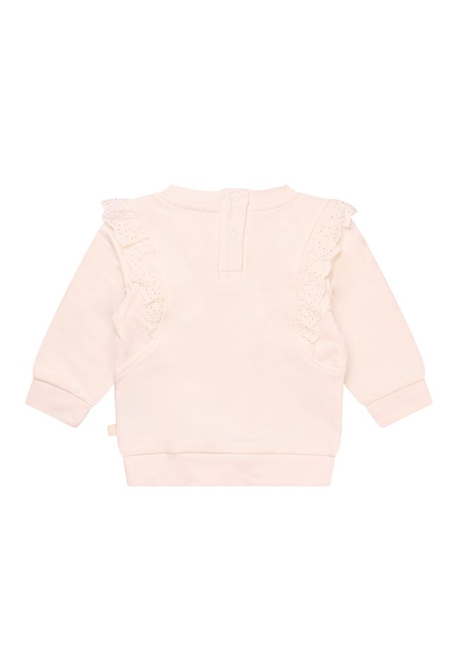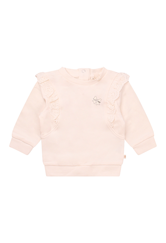 Deze schattige newborn sweater is speciaal ontworpen voor de allerkleinsten, met oog voor zowel comfort als stijl. De broderie ruches lopen speels van de voorkant over de schouders naar de achterkant en geven de sweater een romantische uitstraling. Op de voorkant zit een lieve opdruk van een strikje met subtiele glitters. Dankzij de drukknopjes op de achterkant is de sweater makkelijk aan en uit te trekken.