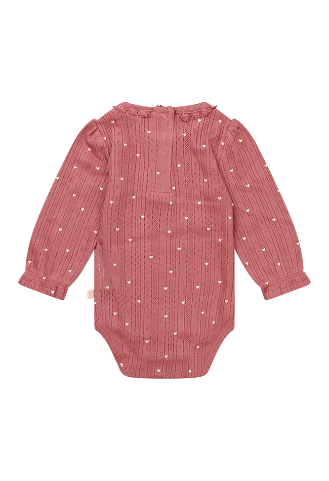 Dit rompertje voor newborn meisjes is een echte must-have. Gemaakt van zacht biologisch katoen met een fijne ajourstructuur en een lieve all-over hartjesprint. De pofmouwtjes en het kanten randje langs de hals en mouwen geven het rompertje een klassieke en verfijnde uitstraling. Dankzij de handige drukknoopsluiting is verschonen snel en makkelijk.