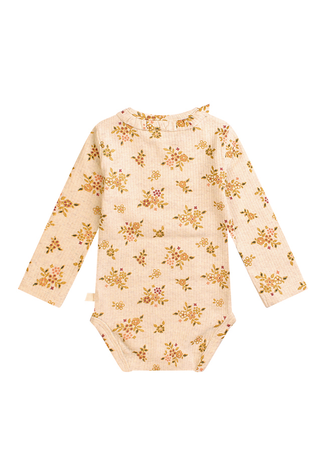 Dit schattige rompertje voor je babymeisje is een echt feestje! Het heeft een zachte ribstof met een subtiele glitter in de bloemenprint en een speelse ruches langs de halslijn. Gemaakt van biologisch katoen is het niet alleen stijlvol, maar ook zacht en comfortabel voor de gevoelige huid van je kleintje.