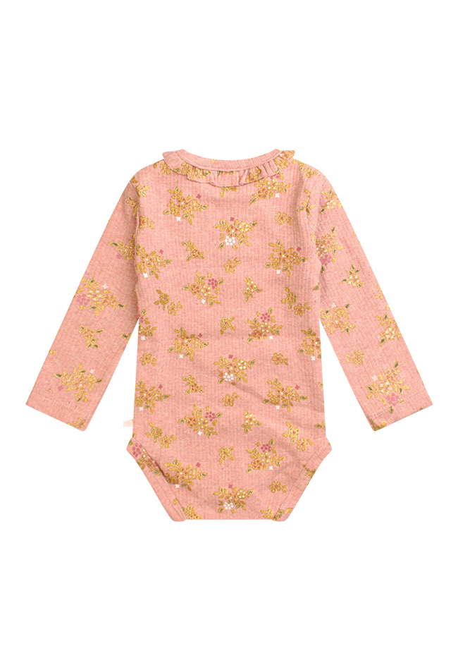 Dit schattige rompertje voor je babymeisje is een echt feestje! Het heeft een zachte ribstof met een subtiele glitter in de bloemenprint en een speelse ruches langs de halslijn. Gemaakt van biologisch katoen is het niet alleen stijlvol, maar ook zacht en comfortabel voor de gevoelige huid van je kleintje.