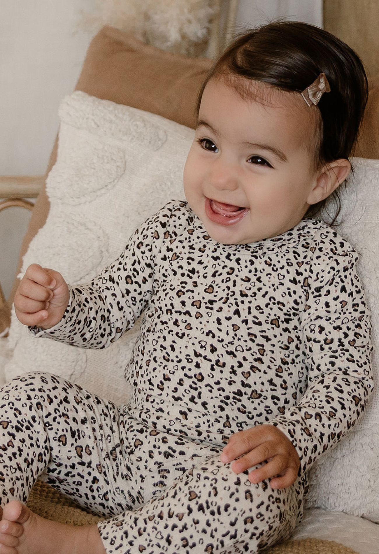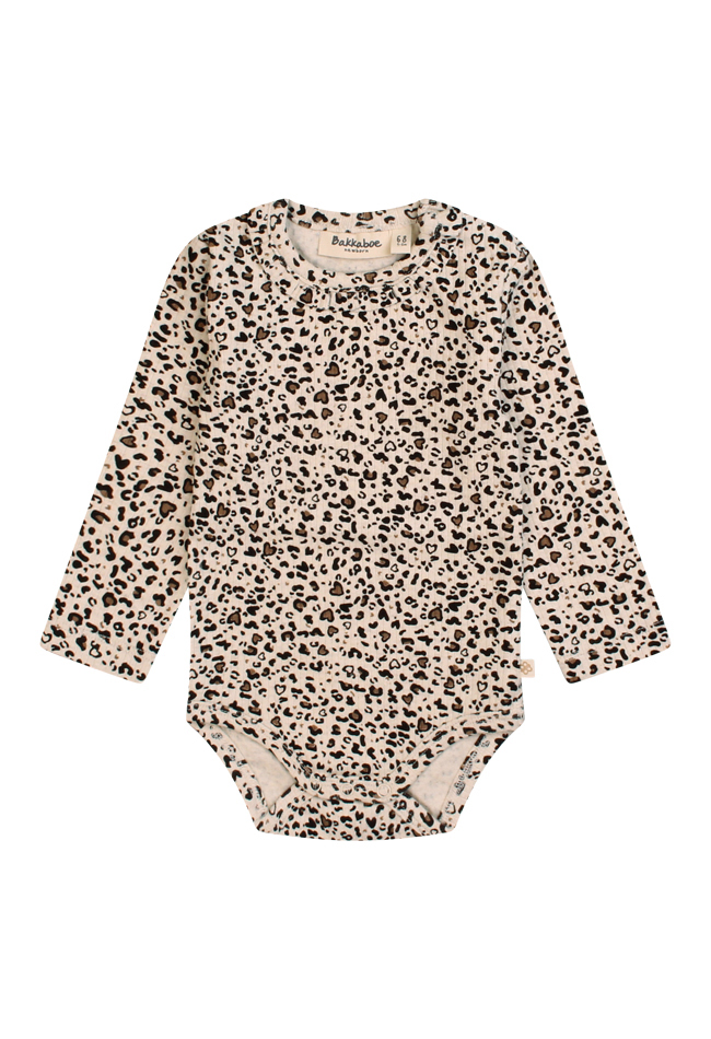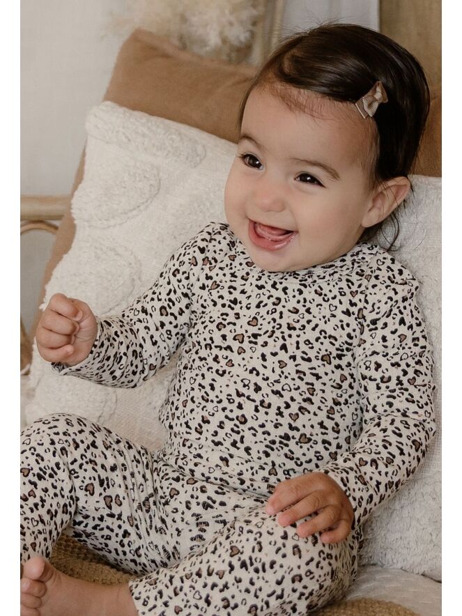 Dit trendy rompertje met panterprint heeft een leuke twist: subtiele hartjes zijn in het print verwerkt! Het rompertje is afgewerkt met een speelse ruches langs de halslijn en gemaakt van biologisch katoen voor extra comfort. Dankzij de praktische drukknopen is het makkelijk aan en uit te trekken.