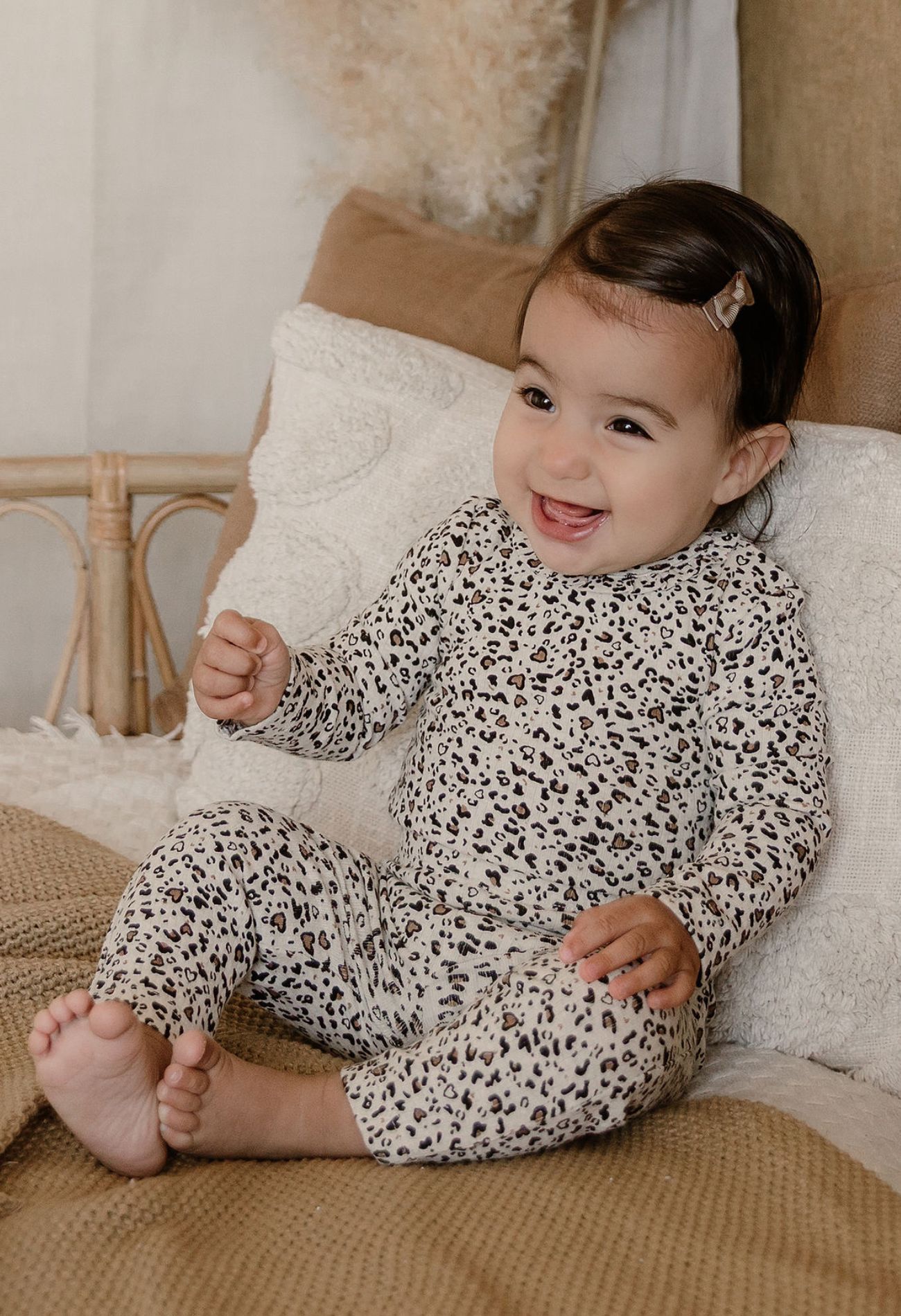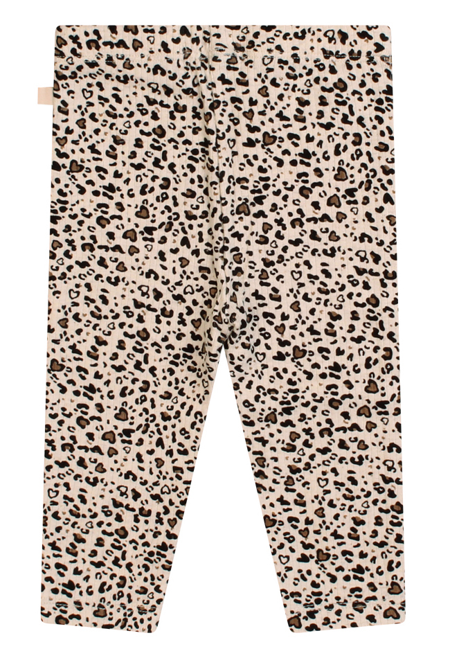 Deze panterprint legging is de perfecte match voor het bijpassende rompertje! (w10318) Met de subtiele hartjes in het panterprint heeft de legging een speelse, trendy uitstraling. Gemaakt van biologisch katoen voor ultiem comfort en met een elastische tailleband die lekker meerekt voor een goede pasvorm.
