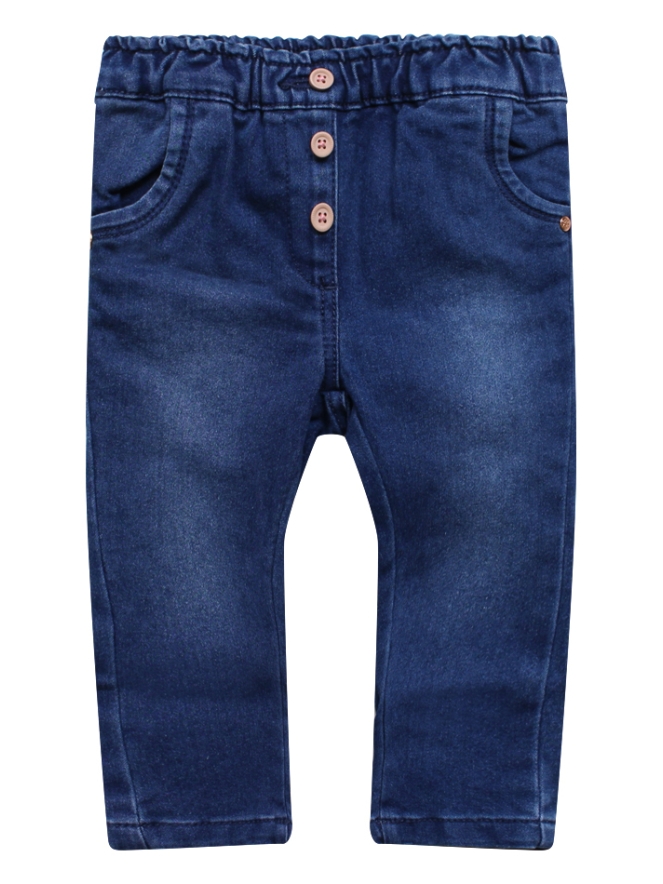 Jeans van Bakkaboe. De jeans hebben veel stretch en elastieken taille met sier knopen. Materiaal: 70% katoen, 28% polyester, 2% elasthan. Wassen op 30 graden, niet bleken, niet in de droger, kan gestreken worden.