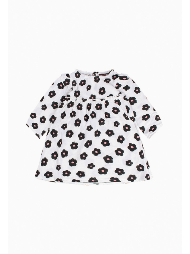 Dit heerlijk 100% luchtige katoenen jurkje is ideaal voor jouw kleine meisje. Zomerjurk of najaarsjurk? Het kan beide! Op de rug zitten twee knoopjes in hout look wat het aantrekken makkelijker maakt. De bloemetjes zijn uiterst zoet, net als jouw meisje straks als ze deze aan heeft!