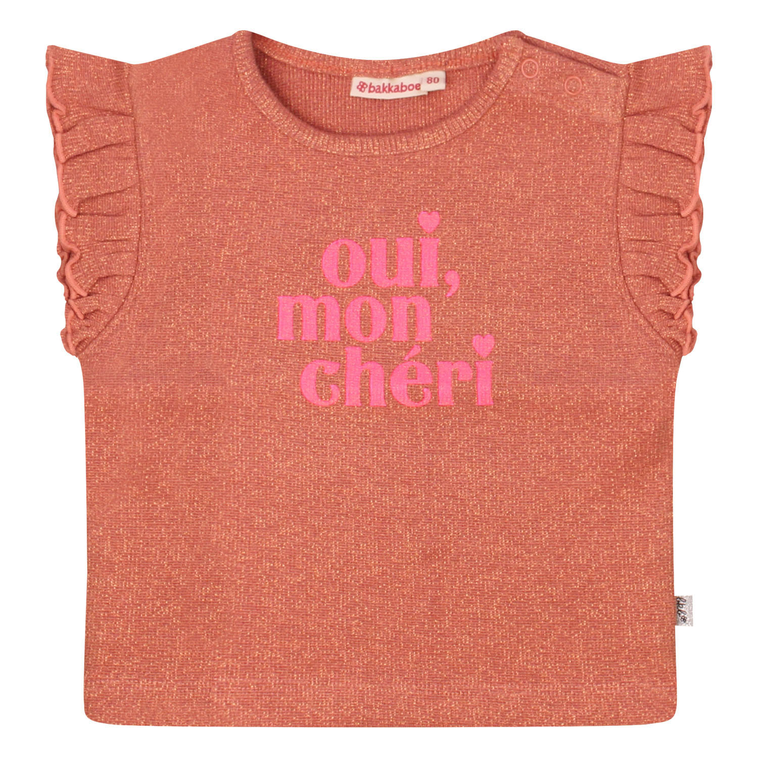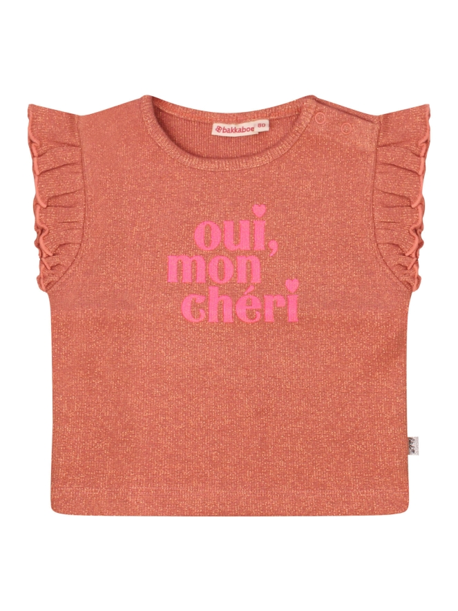 Ontdek dit Oui, mon chéri meisjes shirtje. Gemaakt van een iets dikkere stof met sprankelende glitterafwerking in goud of brons. Perfect voor zowel een speciale gelegenheid als een fashionable everyday look. De verfijnde ruche op de schouders zorgt voor een speels en charmant detail dat het shirt net dat beetje extra geeft. Combineer het met een rokje voor een feestelijke outfit of draag het met de bijpassende flair voor de perfecte co-ord set. Art.nr. Z10036