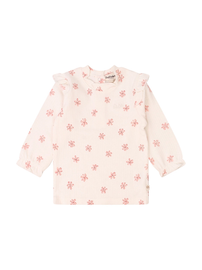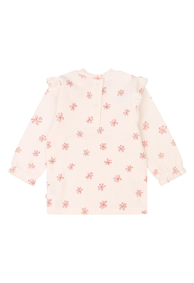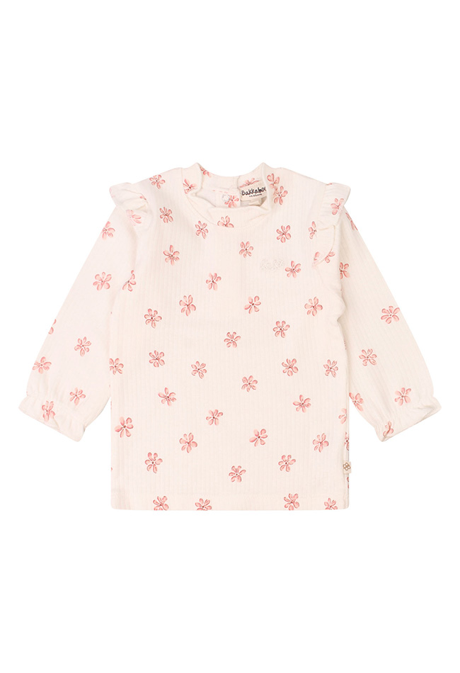Heerlijk shirtje met schattige bloemetjes opdruk. De stof heeft een fijne rib en rekt mooi mee. Met ruches over de schouder en een elastiekje in het mouwuiteinde.