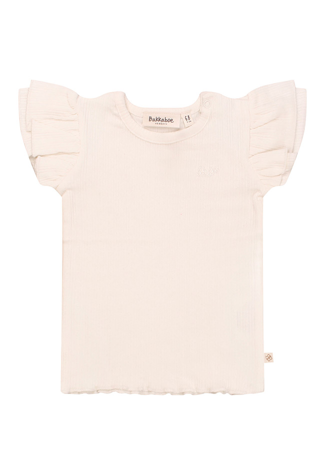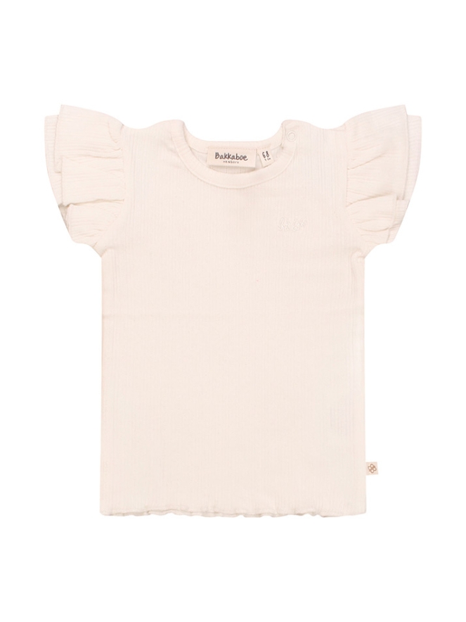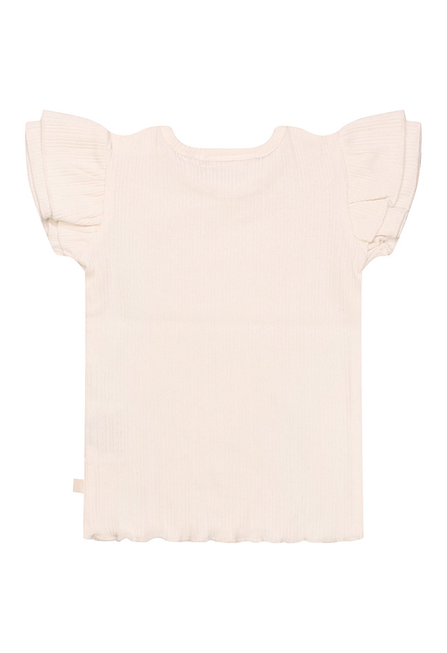 T-shirtje in een fijne fib ajour met een mooie ruchemouw. Dit shirtje rekt heerlijk mee en heeft drukknoopjes op de schouder.