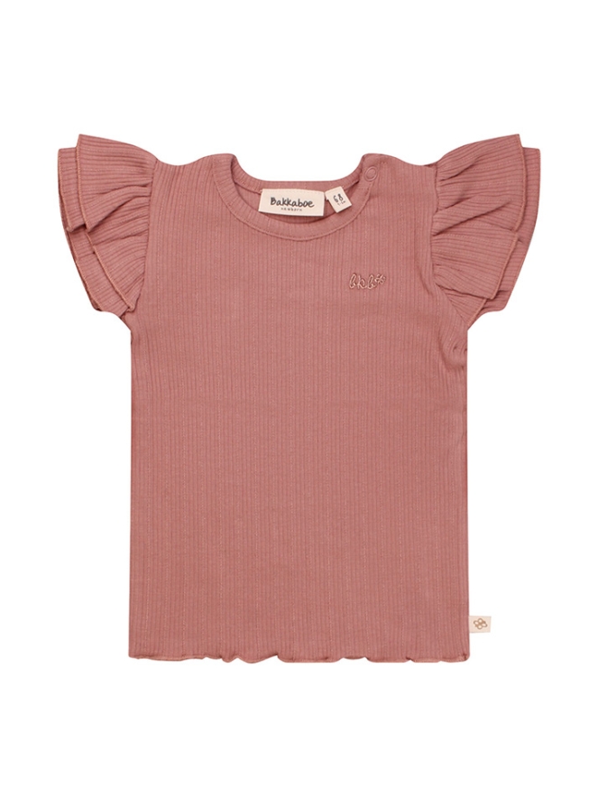 T-shirtje in een fijne fib ajour met een mooie ruchemouw. Dit shirtje rekt heerlijk mee en heeft drukknoopjes op de schouder.