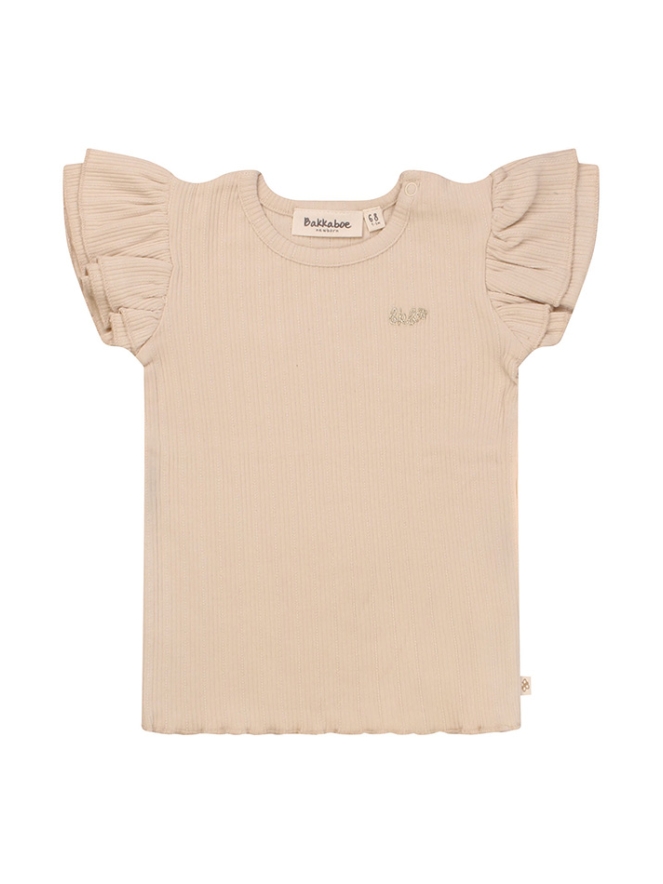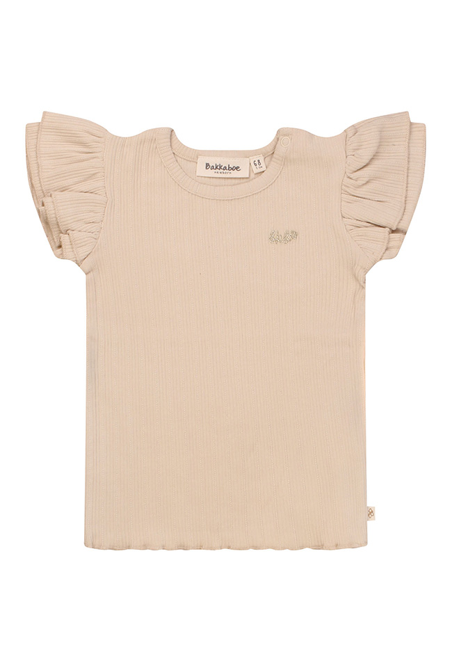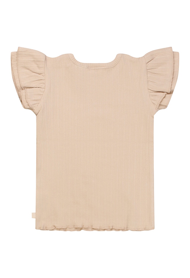 T-shirtje in een fijne fib ajour met een mooie ruchemouw. Dit shirtje rekt heerlijk mee en heeft drukknoopjes op de schouder.