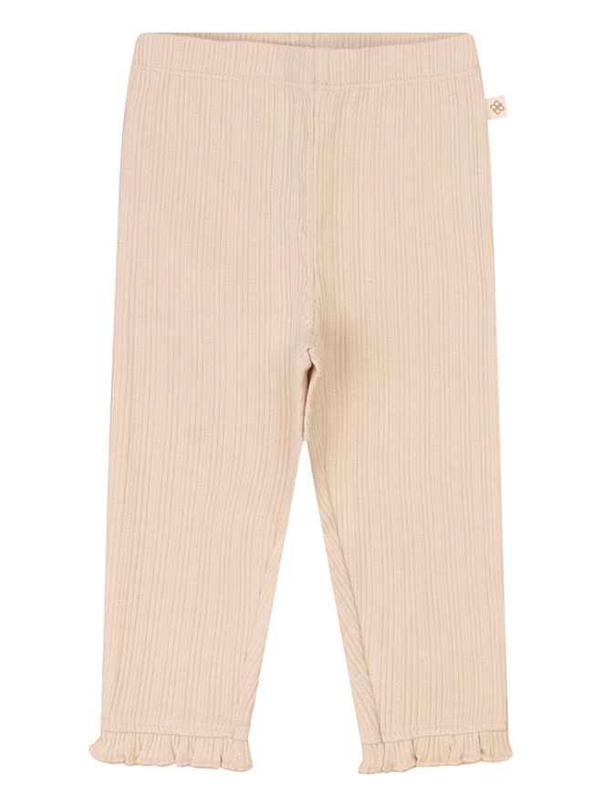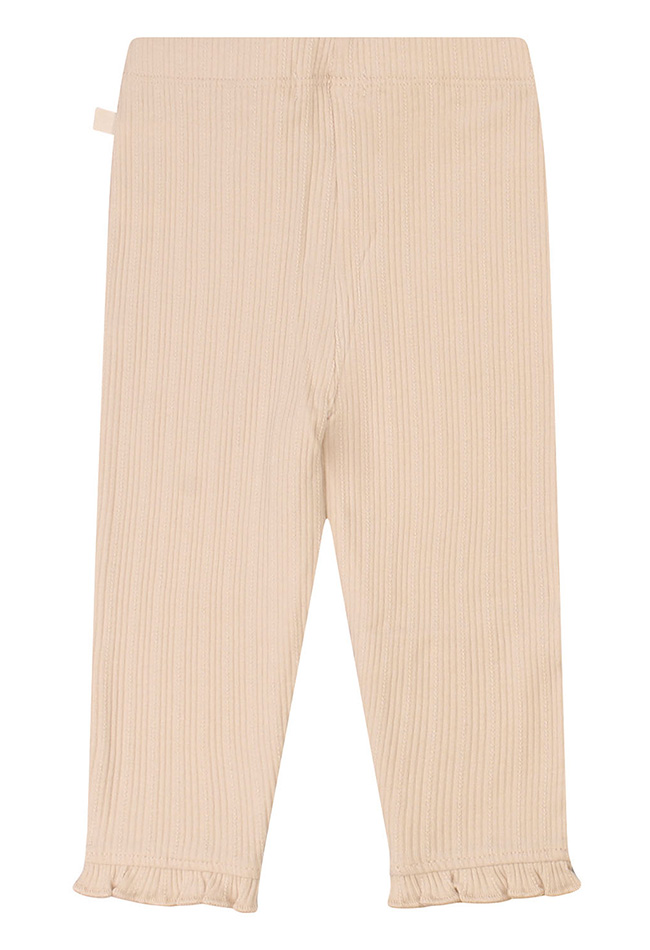 Fijne basic legging met een fijn en sierlijk ribje in de stof. Deze legging voor de pasgeborene is goed rekbaar, zit comfortabel door de elastische tailleband en heeft een mooie ruche rond de enkel.