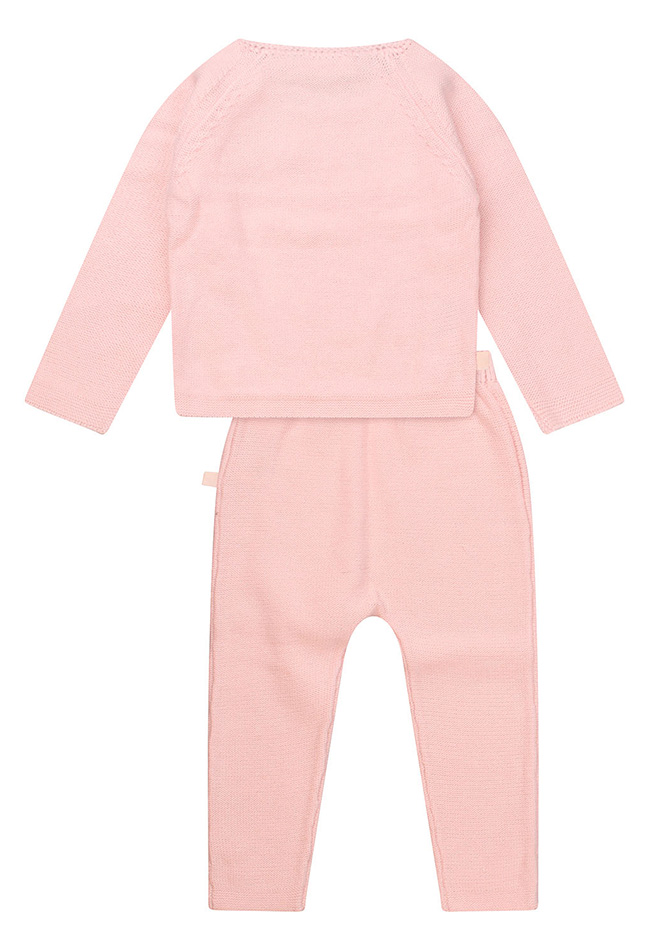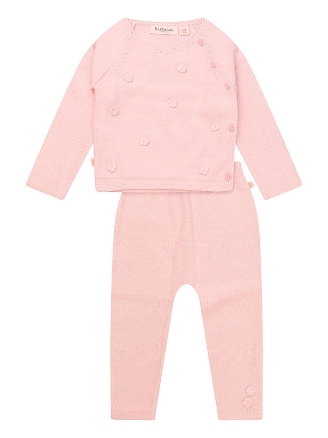 Deze prachtige set bestaat uit een trui met opgestikte bloemetjes met een bijpassend broekje met dezelfde bloemen opgestikt. De stof is fijn gebreid en is van bio katoen. De trui heeft over het gehele voorpant van boven tot onder een knoopsluiting wat het aan en uitdoen vereenvoudigt.