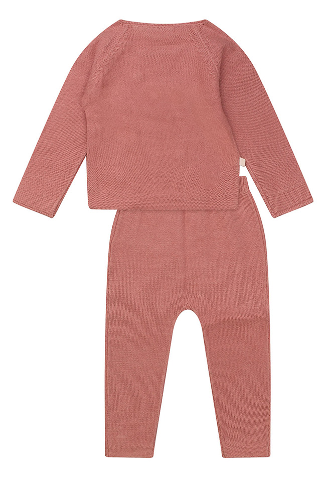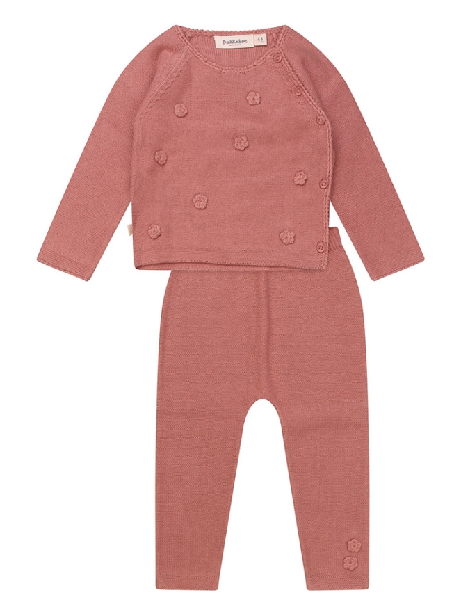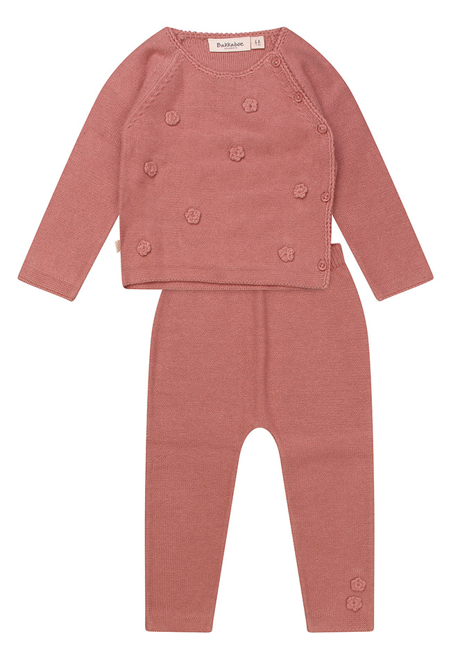 Deze prachtige set bestaat uit een trui met opgestikte bloemetjes met een bijpassend broekje met dezelfde bloemen opgestikt. De stof is fijn gebreid en is van bio katoen. De trui heeft over het gehele voorpant van boven tot onder een knoopsluiting wat het aan en uitdoen vereenvoudigt.