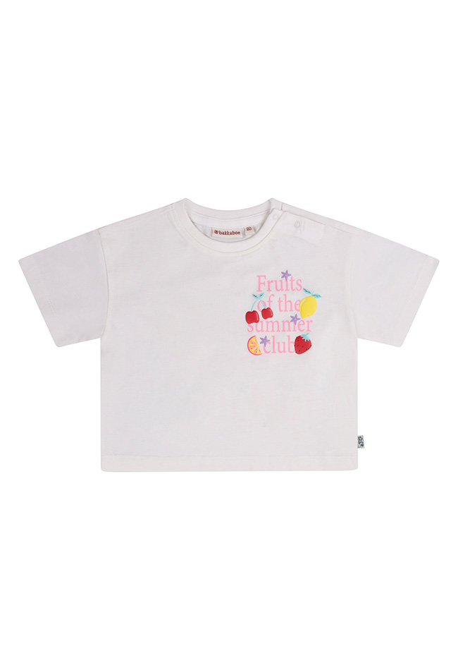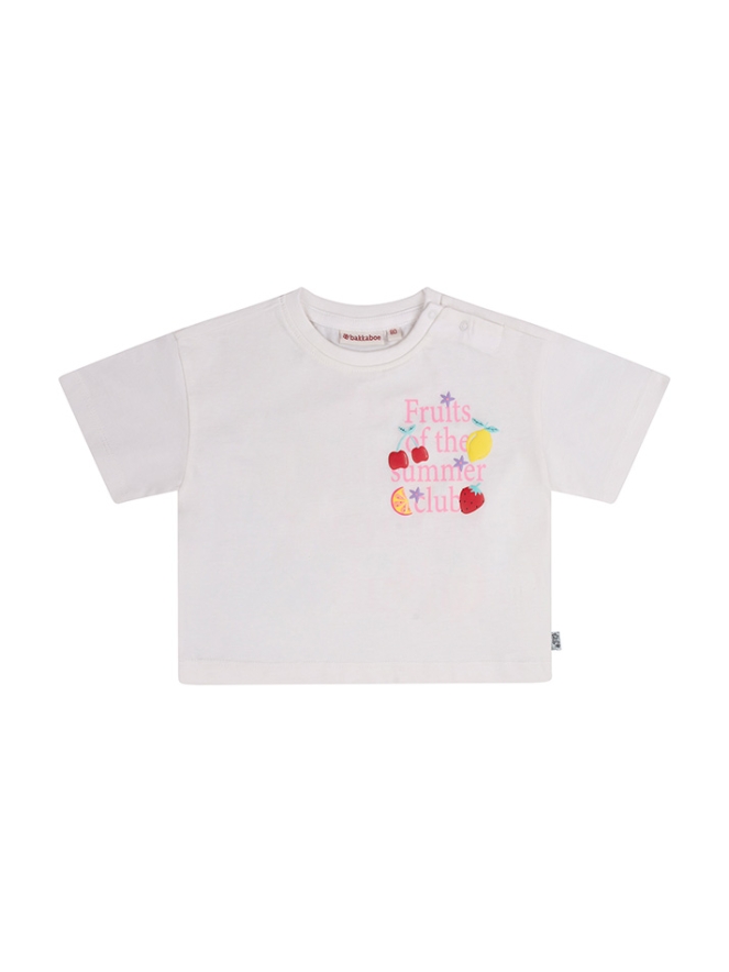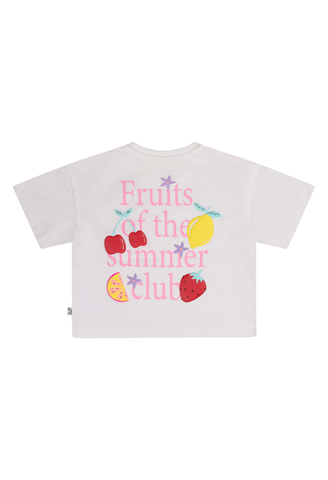 Heerlijk fruitig T-shirt met zowel voorop als achterop een zomerse fruit print. Fruits of the summer club! Dit shirtje valt iets wijder en is een boxy fit.