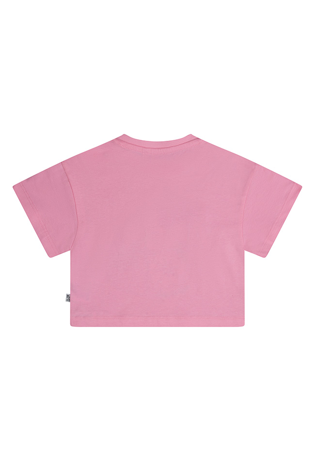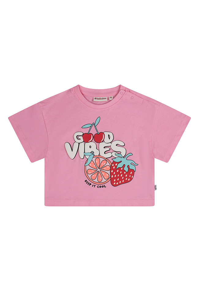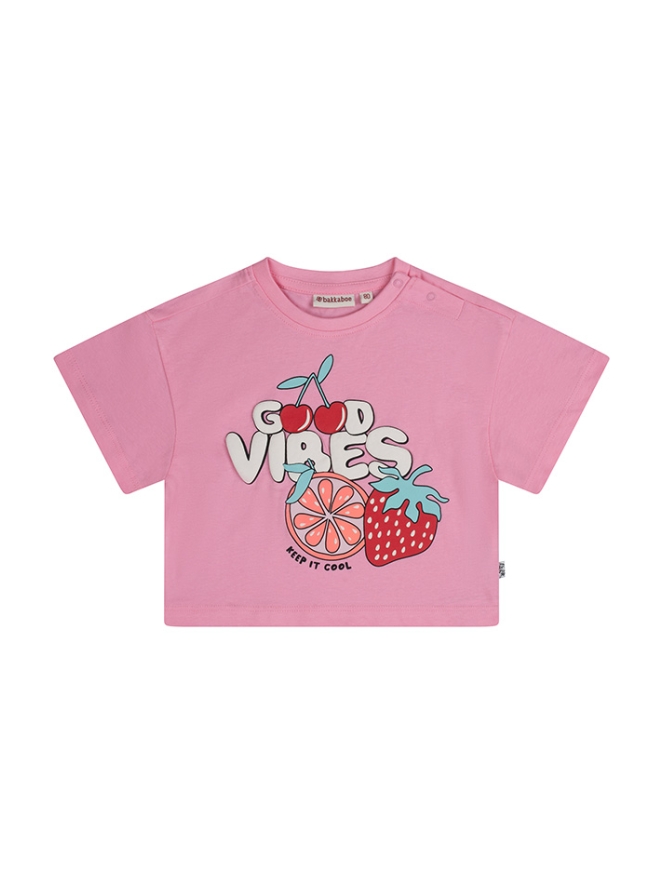 Vrolijk T-shirtje met een fruity print met kersen, aardbei en een granaatappel. Good vibes only! Dit shirtje valt wat wijder en is een boxy fit.