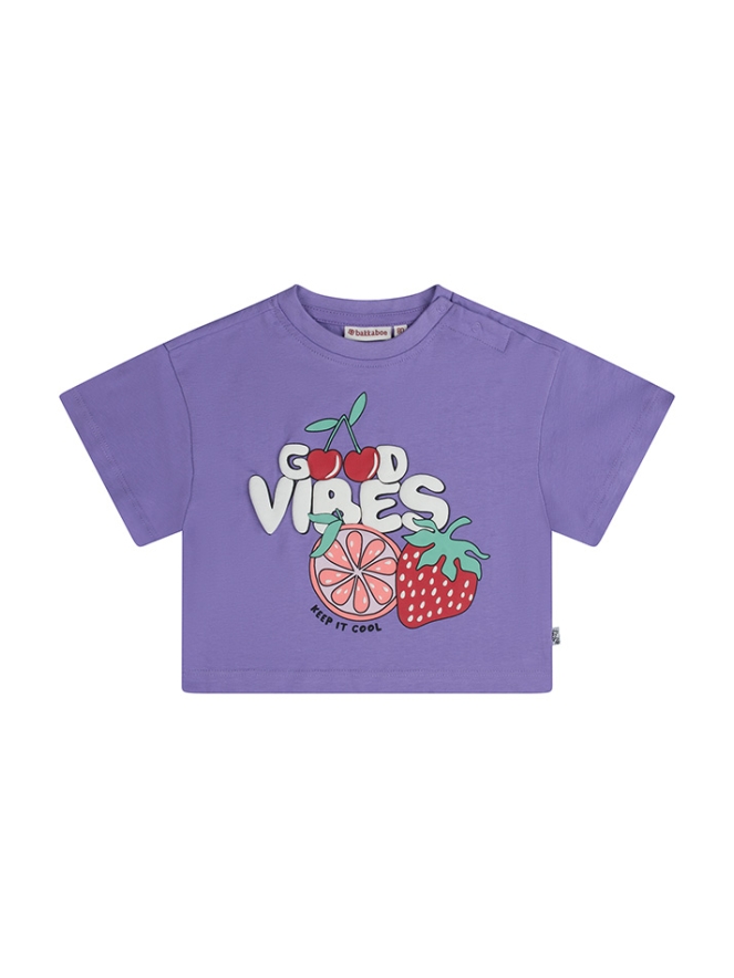 Vrolijk T-shirtje met een fruity print met kersen, aardbei en een granaatappel. Good vibes only! Dit shirtje valt wat wijder en is een boxy fit.