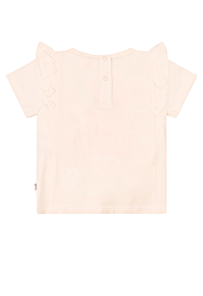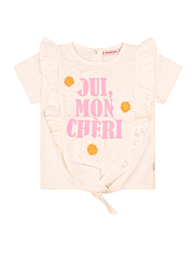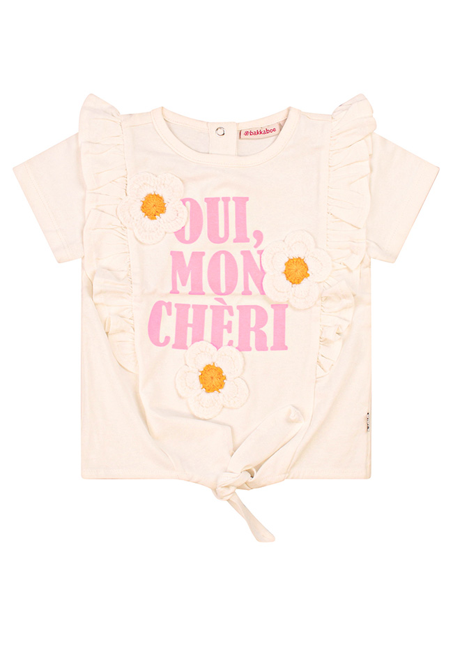 Oui, mon chéri! Dit zomerse knoopshirtje heeft een mooie print voorop met opgestikte gehaakte bloemen. Van de ruches worden we al blij, laat staan als jouw meisje hem aan heeft!