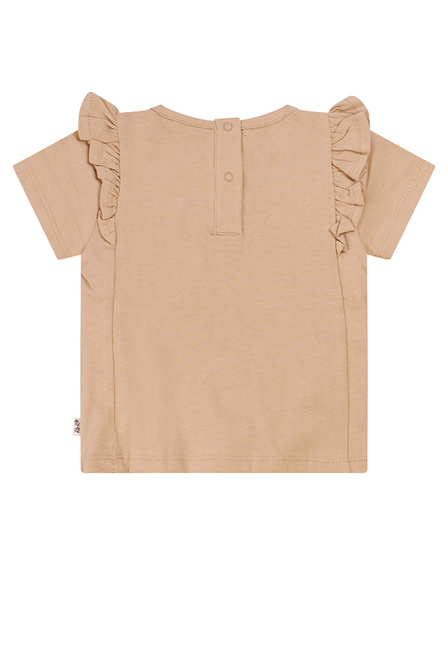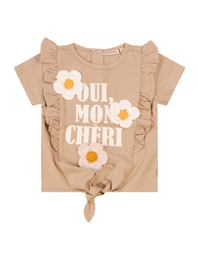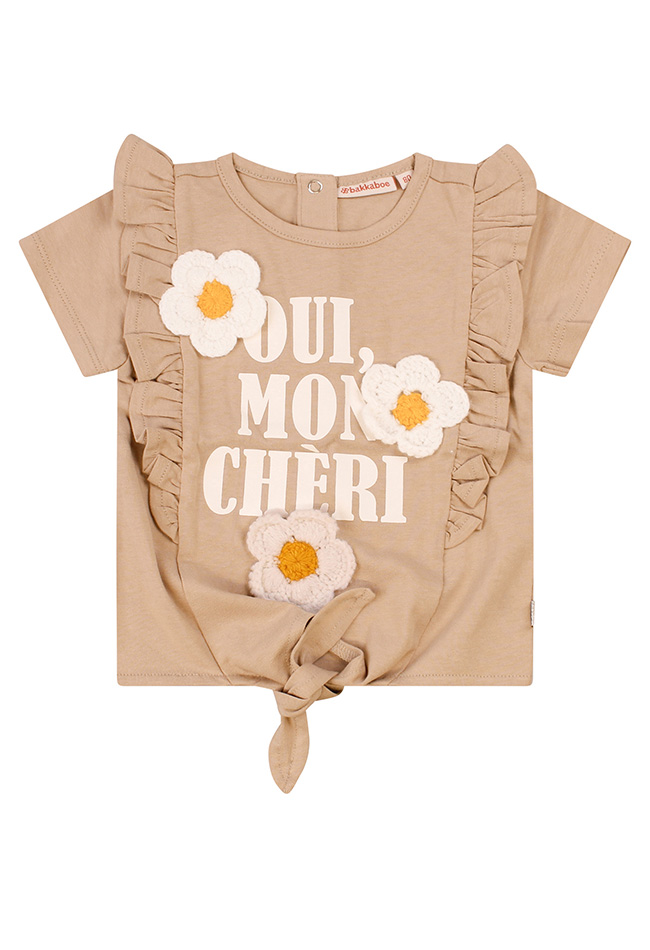 Oui, mon chéri! Dit zomerse knoopshirtje heeft een mooie print voorop met opgestikte gehaakte bloemen. Van de ruches worden we al blij, laat staan als jouw meisje hem aan heeft!