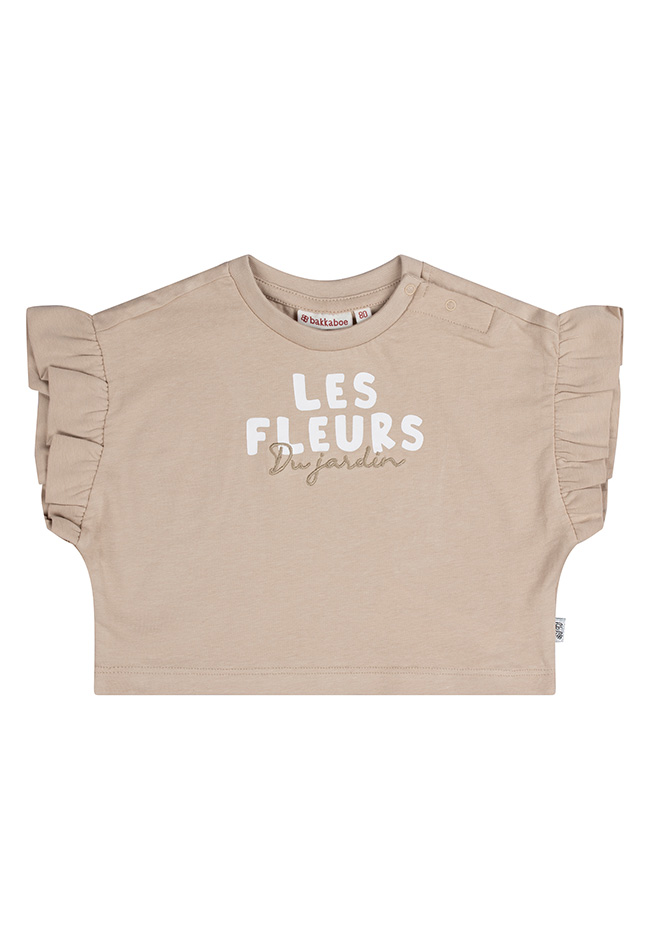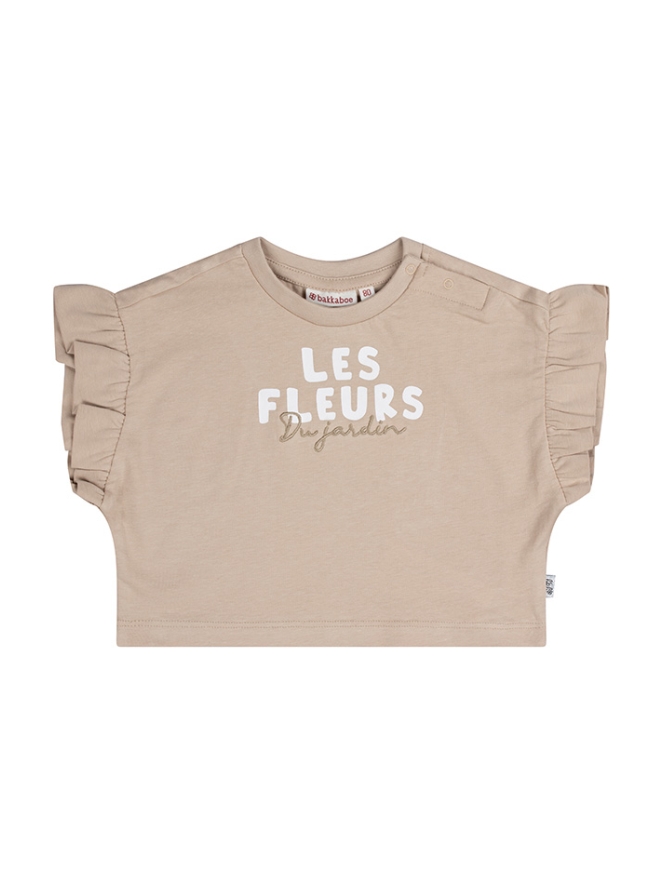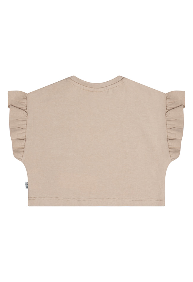 Les fleurs Du jardin. Prachtig shirtje in een neutrale tint met ruchemouw. Voor de liefhebber van nude kleuren een mooi item om eindeloos te combineren. Let op, dit shirtje valt wat wijder en heeft een boxy fit.