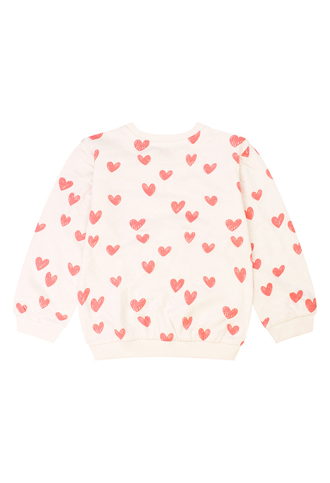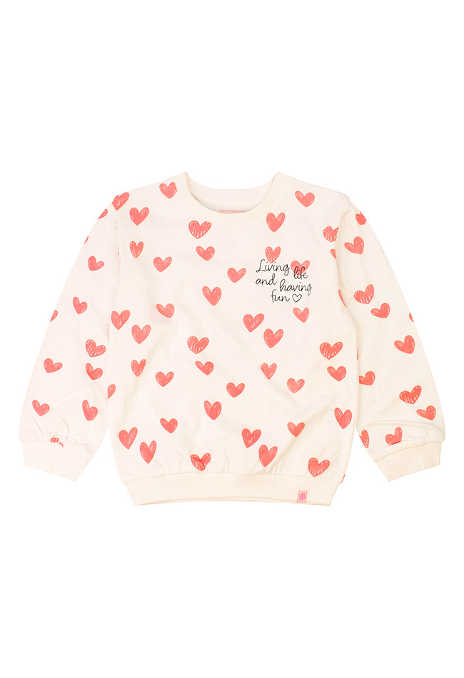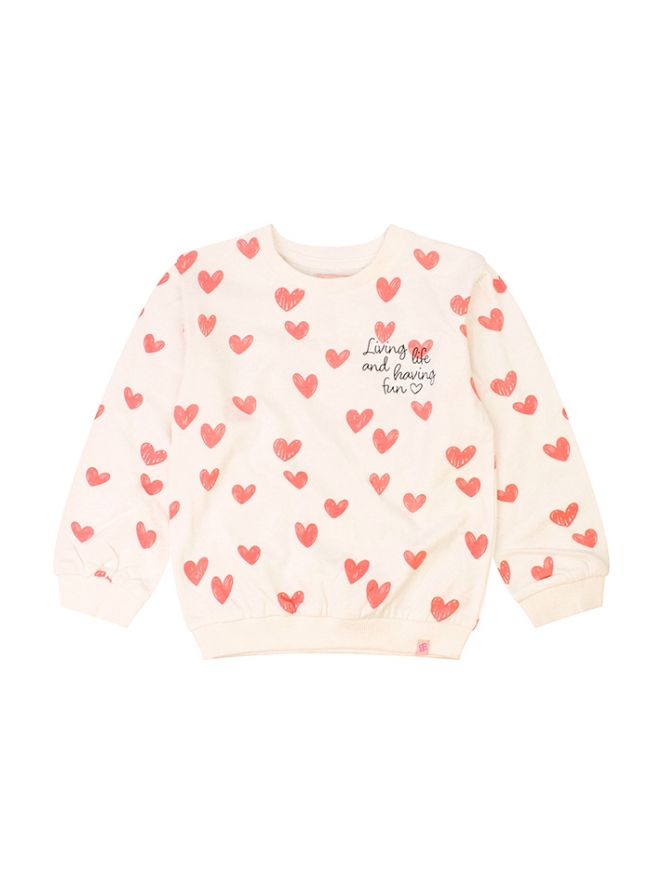 Mega zoete sweater met een allover hartjes print met voorop de tekst; Living life and having fun. Dat belooft wat voor de toekomst!