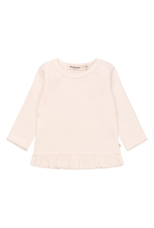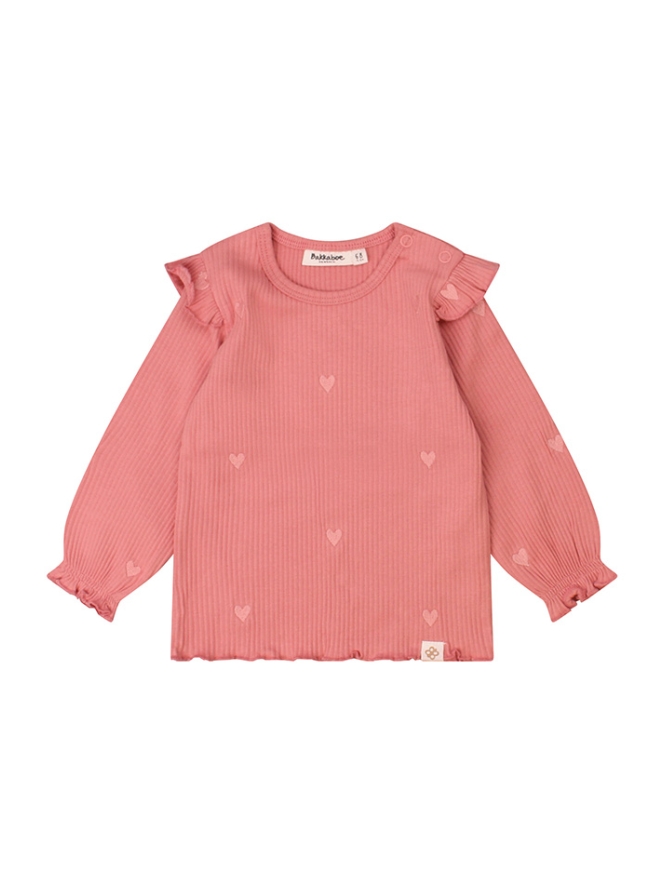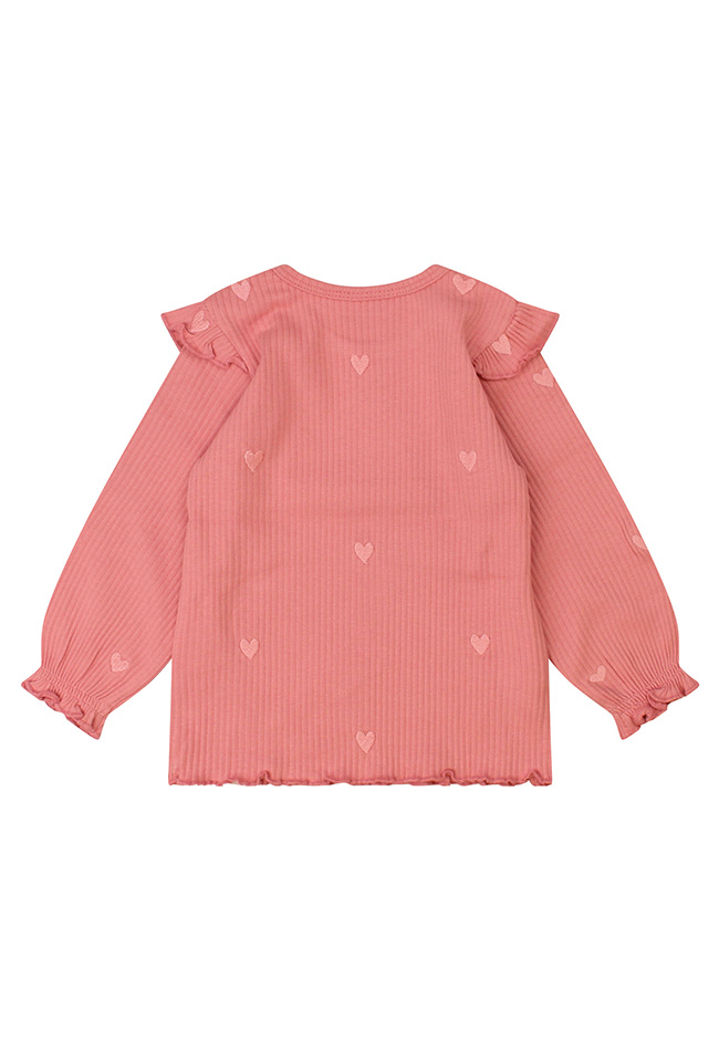 Dit comfortabele T-shirtje met een allover hartjes borduur op de flexibele rib stof is een absolute favoriet. In rustige neutrale kleuren steelt jouw meisje de show!
