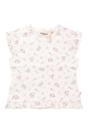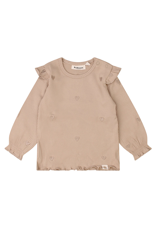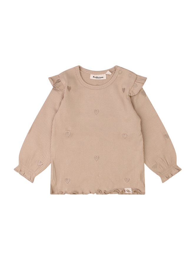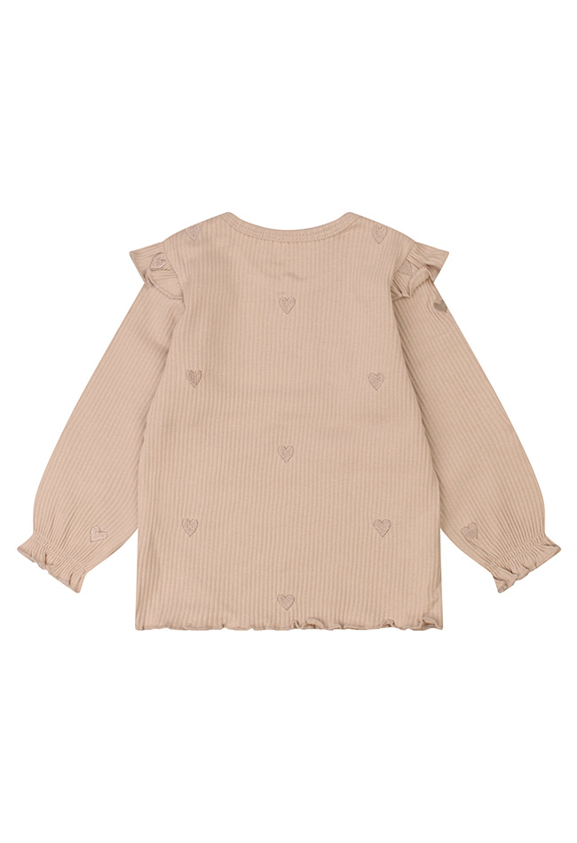 Dit comfortabele T-shirtje met een allover hartjes borduur op de flexibele rib stof is een absolute favoriet. In rustige neutrale kleuren steelt jouw meisje de show!