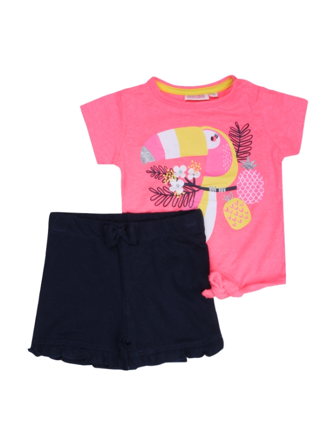 T-shirt en kort broekje set voor baby meisjes. Op het t-shirt staat kakatoe vogel en heeft een knoop aan de onderkant, het broekje heeft ruche afwerking. Materiaal: Broekje: 100% katoen, T-shirt: 65% polyester, 35% katoen