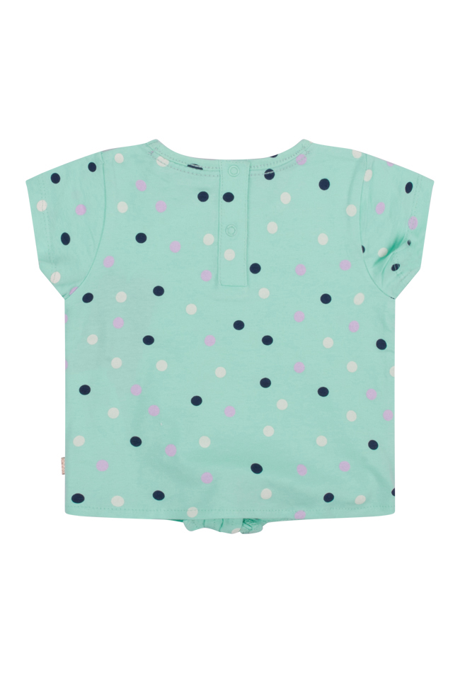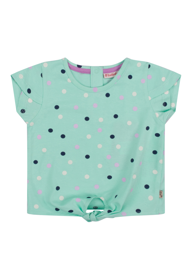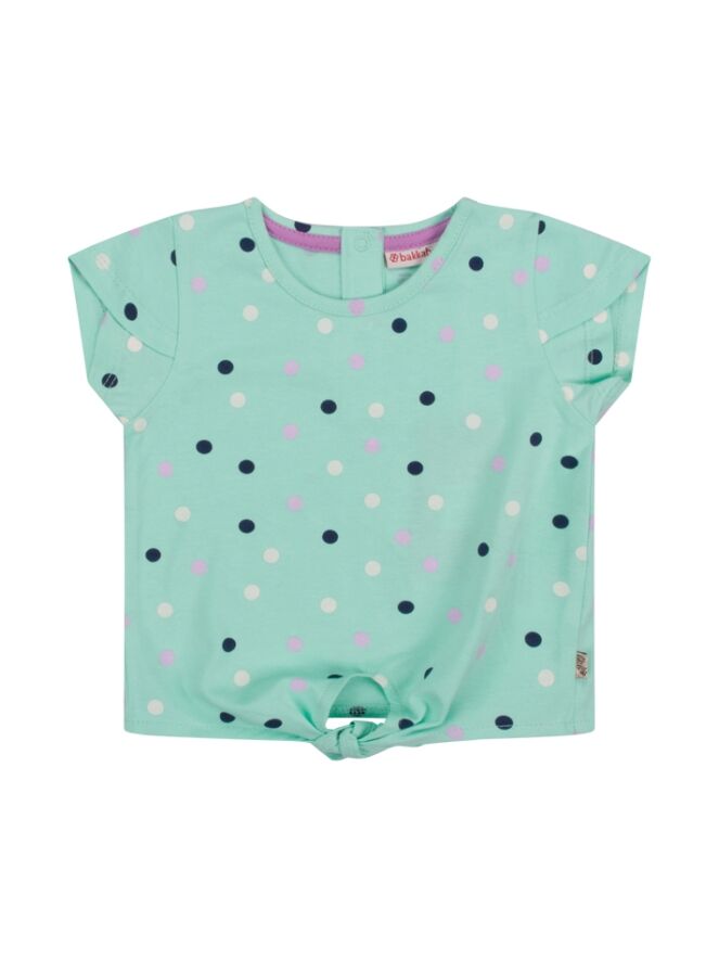 T-shirt van Bakkaboe. Het t-shirt heeft een all over stippen print en een knoop aan de onderkant. Materiaal: 95% katoen, 5% elasthan. Op 30 graden wassen, niet bleken, niet in de droger, kan gestreken worden.