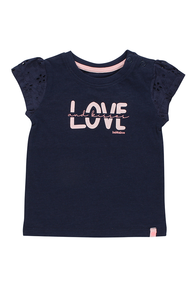 T-shirt met korte mouw van Bakkaboe. Het t-shirt heeft broderie mouwen en een effen body met op de voorkant een glitter tekst. Materiaal: 100% katoen. 30 graden wassen, niet bleken, koud strijken, niet in de droger.