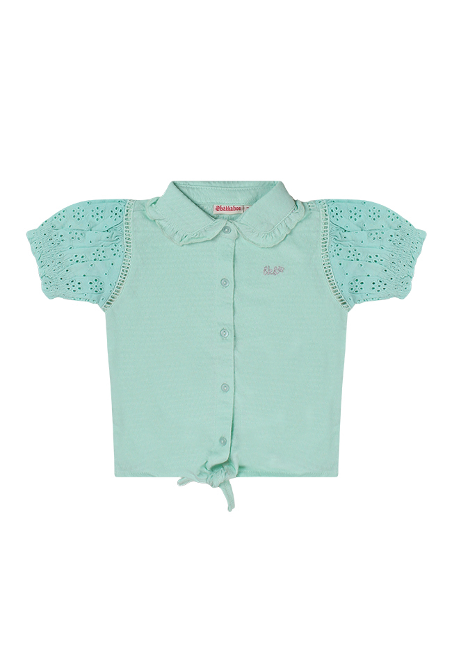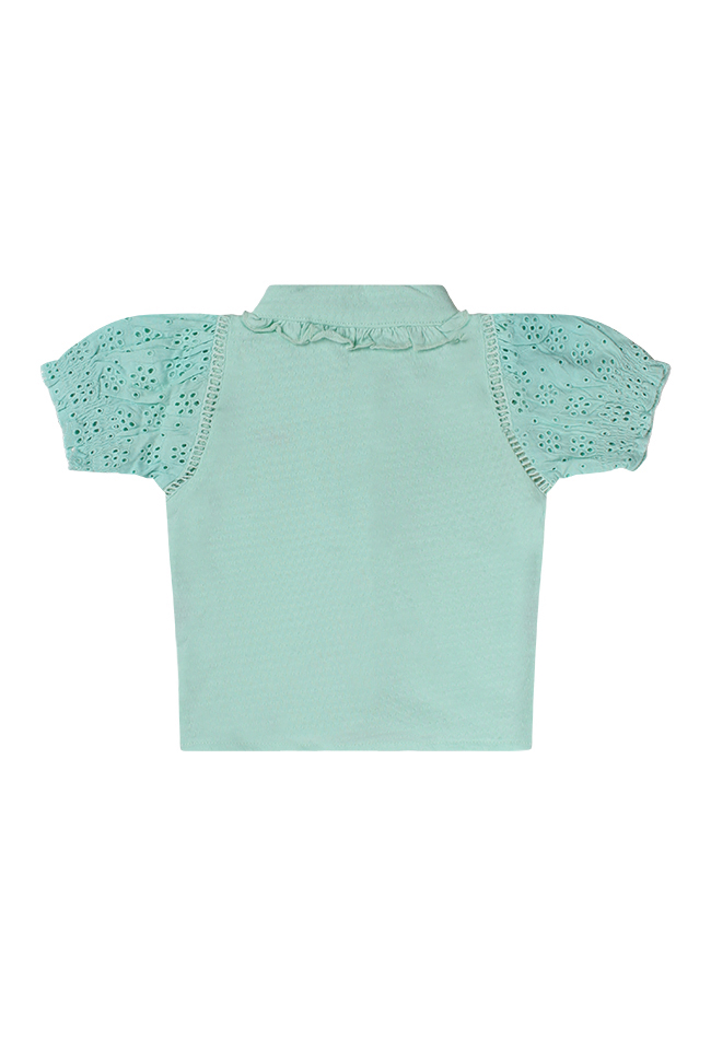 Blouse met korte broderie pofmouwen een kraagje en een knoopdetail aan de voorkant.