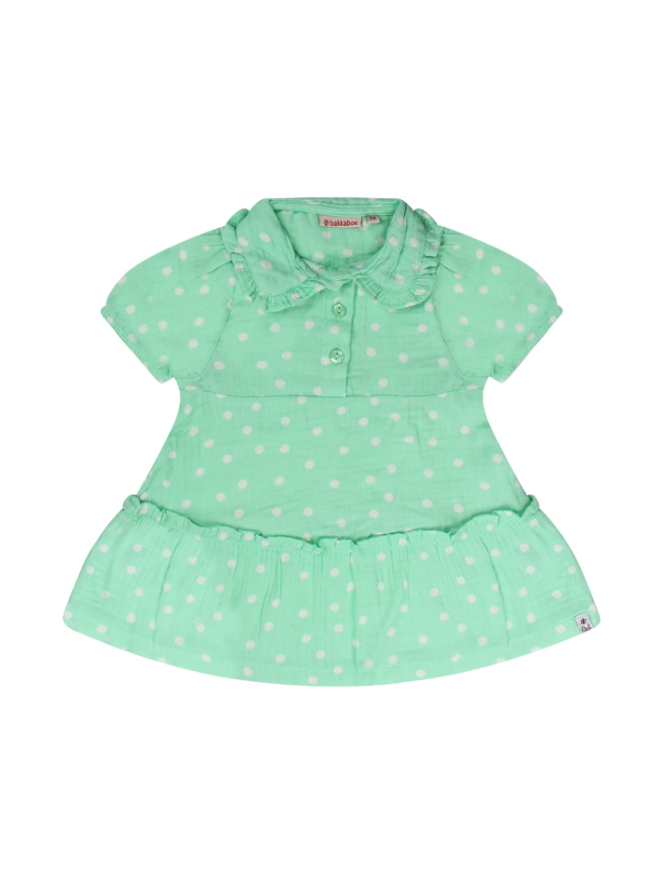 Jurk met een allover stippenprint. De jurk heeft pofmouwen en een ronde kraag. Voorop zit een knoopsluiting en de jurk heeft een stroken rok.