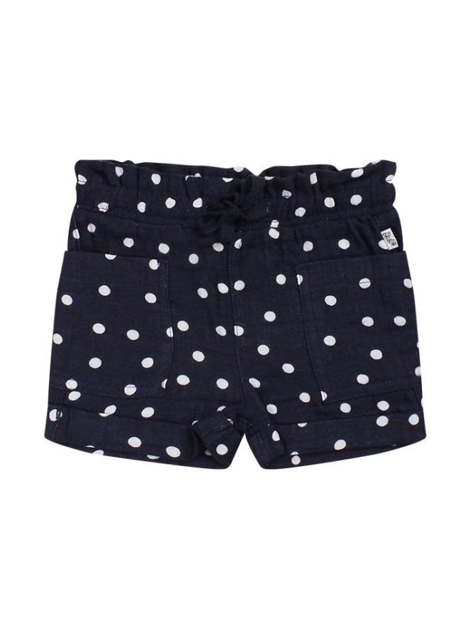 Dit short heeft een allover stippen print met een elastische tailleband met een koord er door om de taille strakker te maken. Het short heeft twee zijzakken.