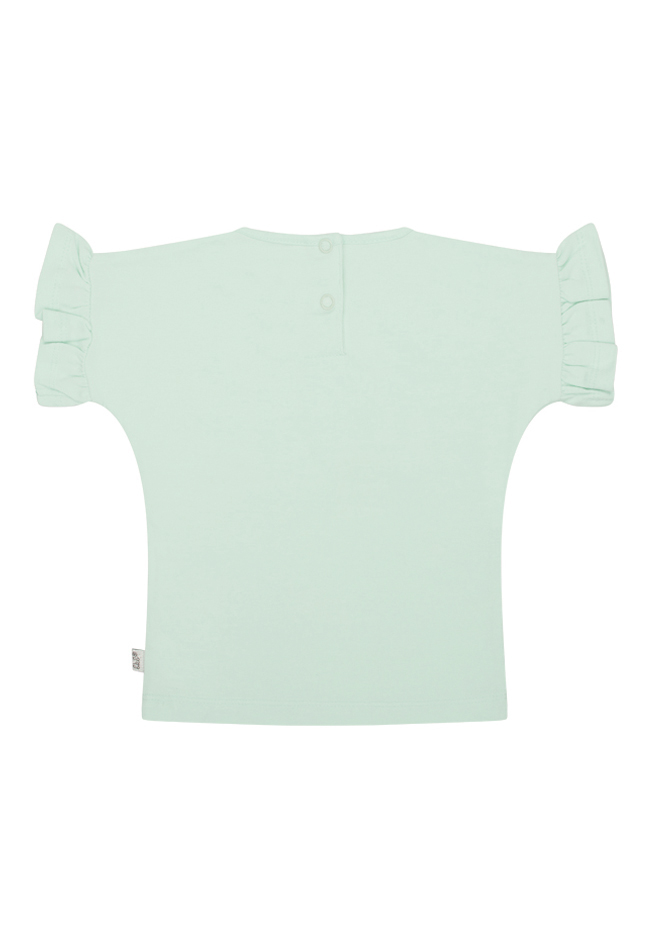 T-shirt met ruffel mouwen van Bakkaboe. Dit zomerse t-shirt is verkrijgbaar in drie kleuren. Op de voorkant zit een geplaatste flamingoprint. Het t-shirt heeft een ronde hals, en de kleinste maten hebben achterop knoopjes bij de hals.