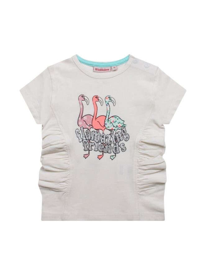 Dit vrolijke t-shirt heeft een glitter flamingo print aan de voorkant. De zijkant van het t-shirt is gerimpeld. Bij de kleinste maten zitten op de schouder twee drukknoopjes zodat het aan/-uittrekken gemakkelijker gaat. Het t-shirt is verkrijgbaar in drie zomerse kleuren.