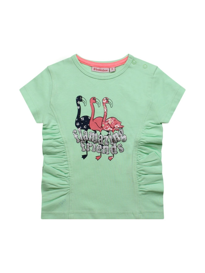 Dit vrolijke t-shirt heeft een glitter flamingo print aan de voorkant. De zijkant van het t-shirt is gerimpeld. Bij de kleinste maten zitten op de schouder twee drukknoopjes zodat het aan/-uittrekken gemakkelijker gaat. Het t-shirt is verkrijgbaar in drie zomerse kleuren.
