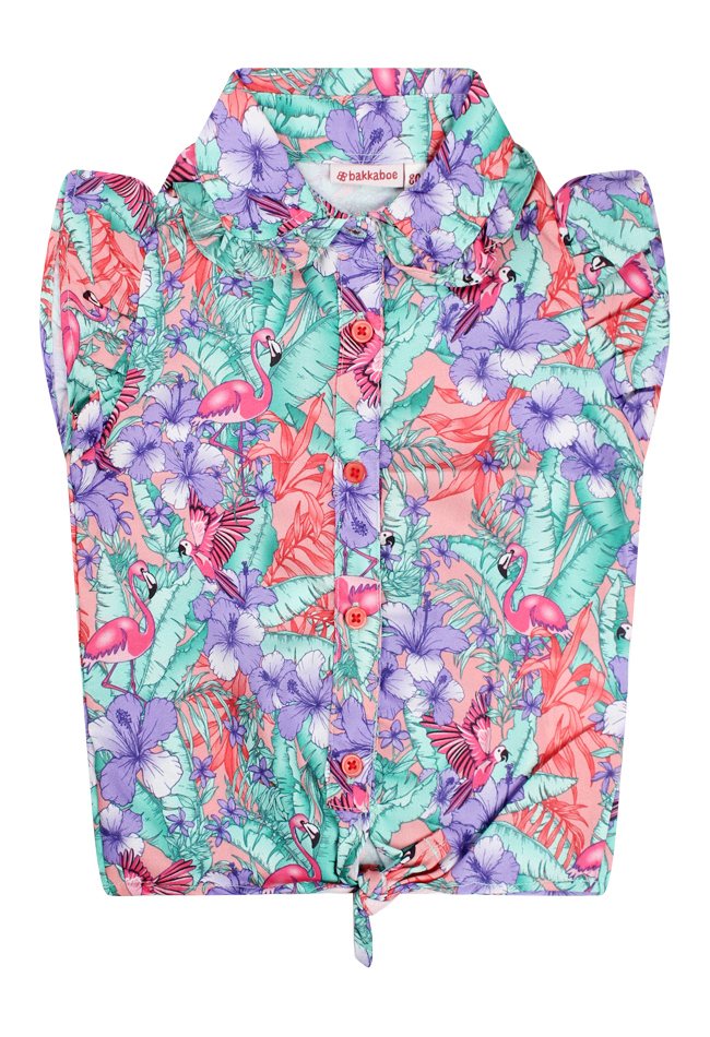 Blouse met een allover tropische print, ronde kraag, vlindermouwen en een strikdetail aan de voorkant.