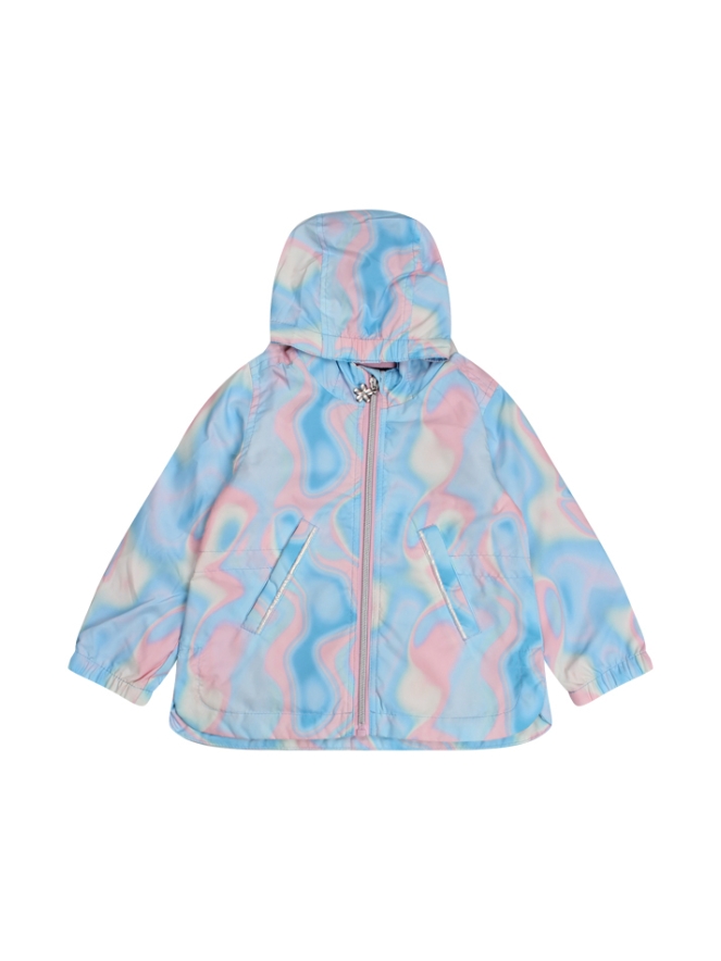 Deze zomerjas heeft een marbleprint in twee verschillende kleuren. De jas heeft strookzakken en een capuchon. Aan de binnenkant zit een voering en een elastische band in de taille die je losser en strakker kunt maken. De rits puller heeft een bloem detail.