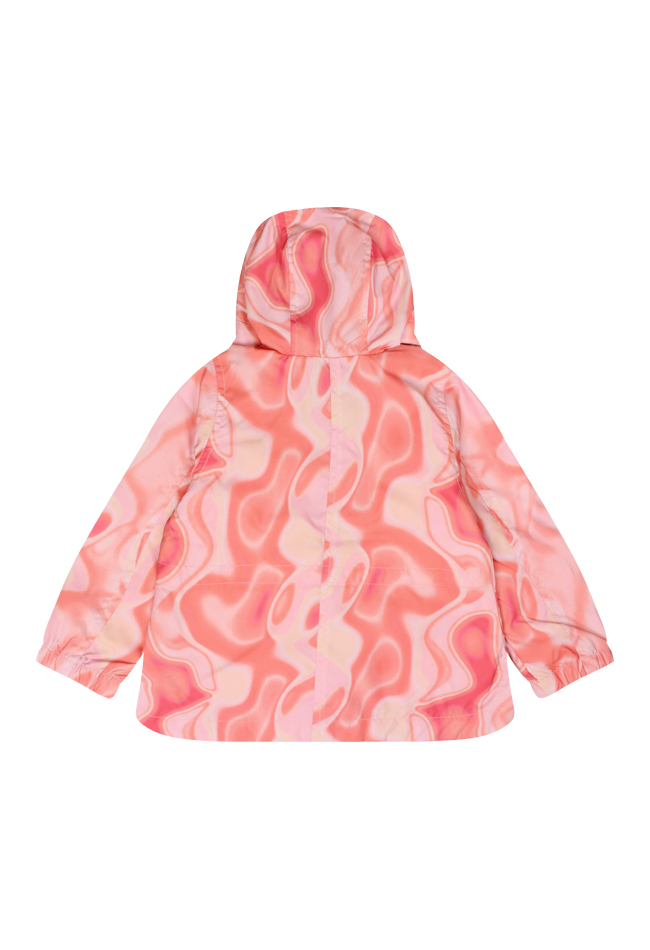 Deze zomerjas heeft een marbleprint in twee verschillende kleuren. De jas heeft strookzakken en een capuchon. Aan de binnenkant zit een voering en een elastische band in de taille die je losser en strakker kunt maken. De rits puller heeft een bloem detail.