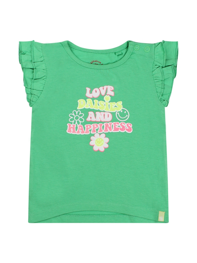 Dit shirtje heeft een korte ruche op de schouders en een ronde hals. Op de voorkant van het t-shirt zit een puff/glitter print. Bij de kleinste maten zitten op de schouder twee drukknoopjes zodat het aan/-uittrekken gemakkelijker gaat. Dit t-shirt is verkrijgbaar in drie zomerse kleuren.