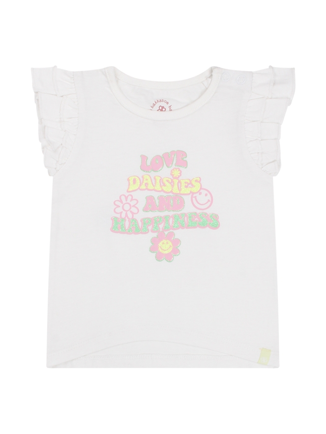 Dit shirtje heeft een korte ruche op de schouders en een ronde hals. Op de voorkant van het t-shirt zit een puff/glitter print. Bij de kleinste maten zitten op de schouder twee drukknoopjes zodat het aan/-uittrekken gemakkelijker gaat. Dit t-shirt is verkrijgbaar in drie zomerse kleuren.