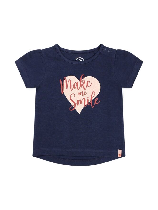 Dit t-shirt met korte mouw en ronde hals, heeft op de voorkant een geplaatste print met een glitterhart met de tekst: Make me Smile. De kleinste maken hebben knoopjes om de hals opening groter te maken. Bij de mouwen zit een kleine rimpeling. Hij is verkrijgbaar in drie verschillende kleuren.