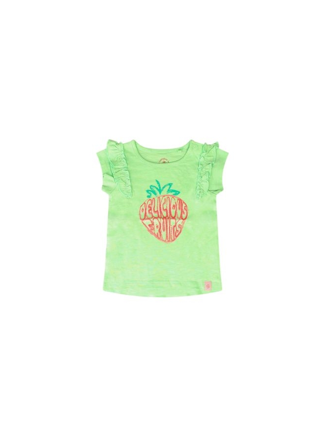 Dit T-shirt een ruche over de schouder en een aardbeien print.